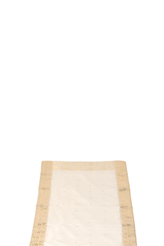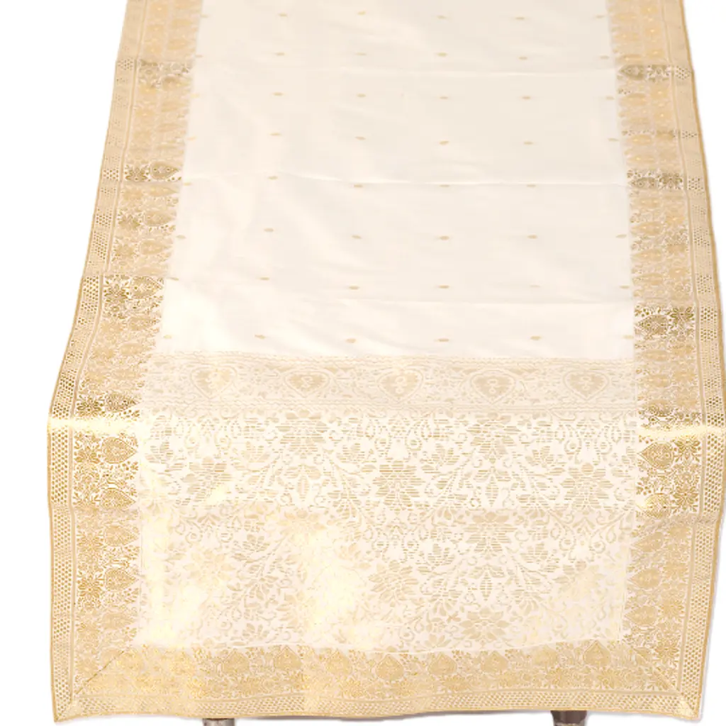 Neutral Cream Handmade Indian Design Table Runner For Wedding Receptions, Party Decorations, And Decor For Every Occasion | Silk Sari Fabric | Ideal Ethnic Tablerunner With Golden Borders.
