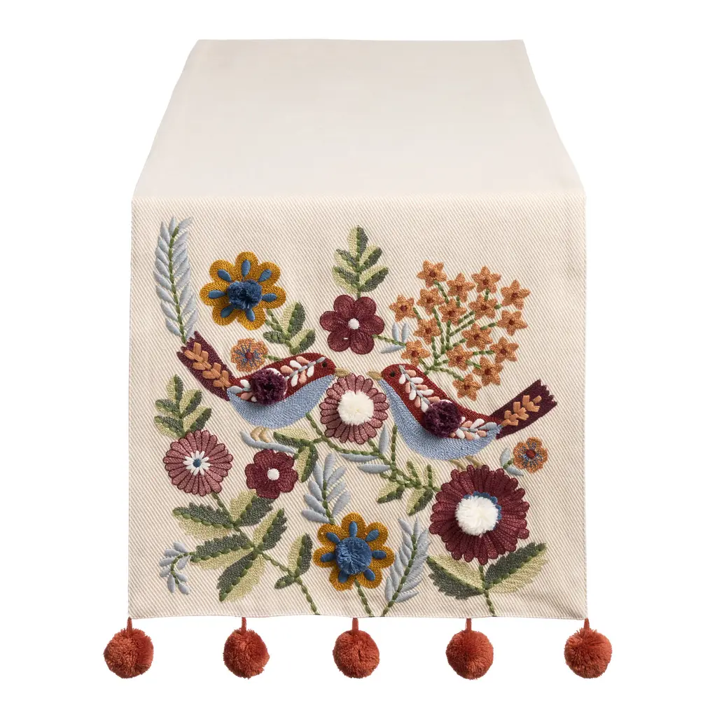 Drawing inspiration from classic Scandinavian designs, our exclusive table runner is made in India with an abundance of dimension and nature-inspired whimsy. An embroidered garden of florals surrounds a pair of birds in muted purple, blue and green tones on an oatmeal ground with playful pom-pom trim. Our attention to detail makes World Market your destination for unique tabletop textiles that affordably refresh your dining decor in a snap.