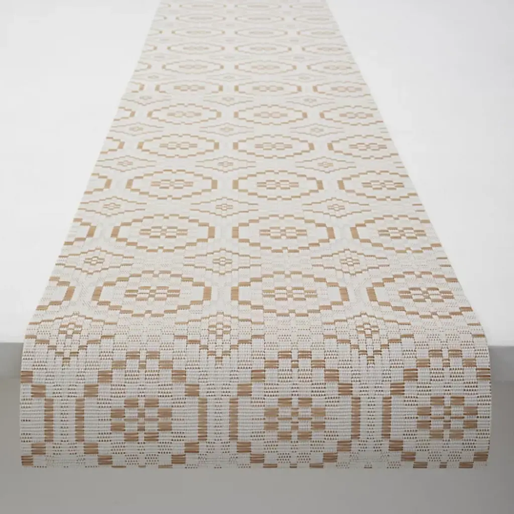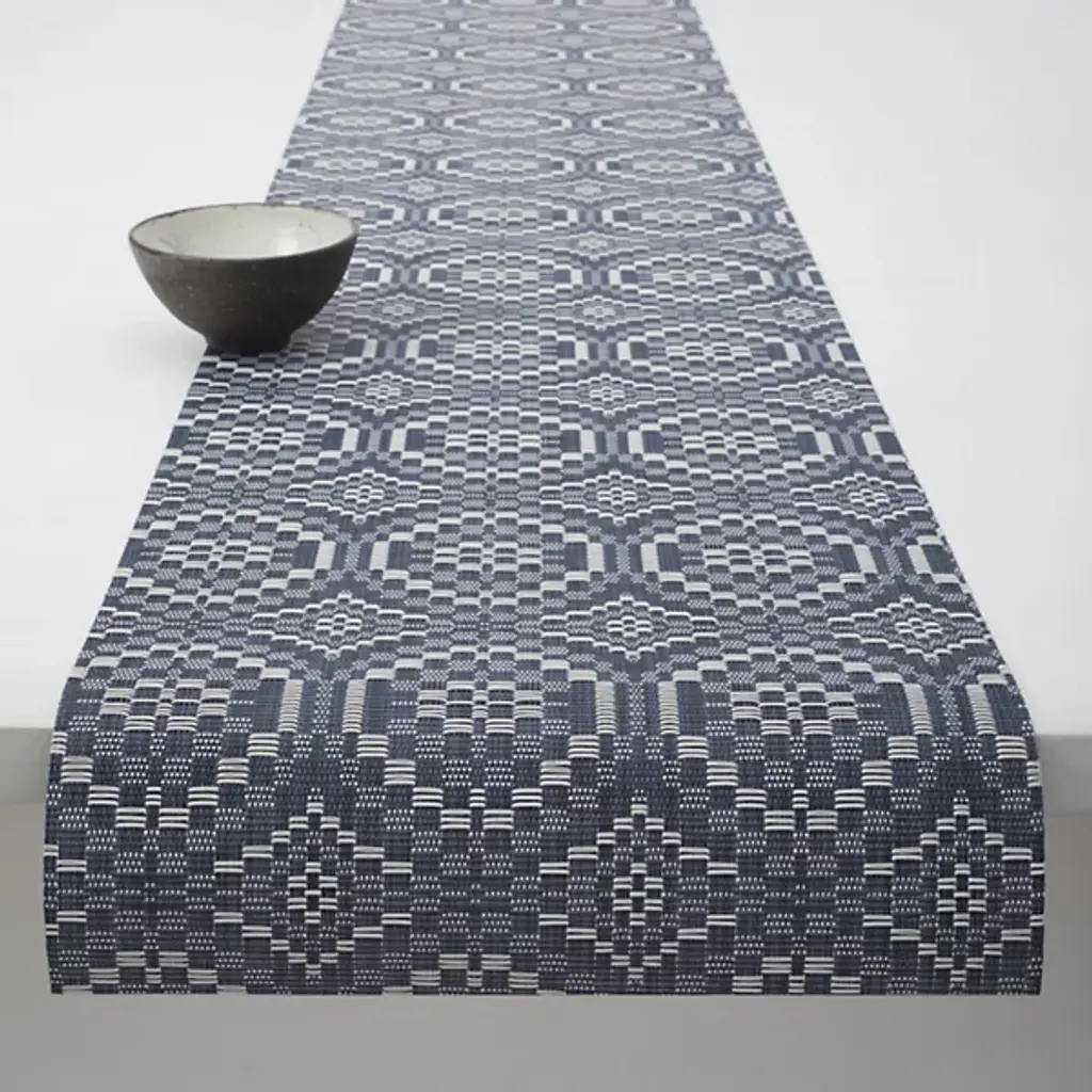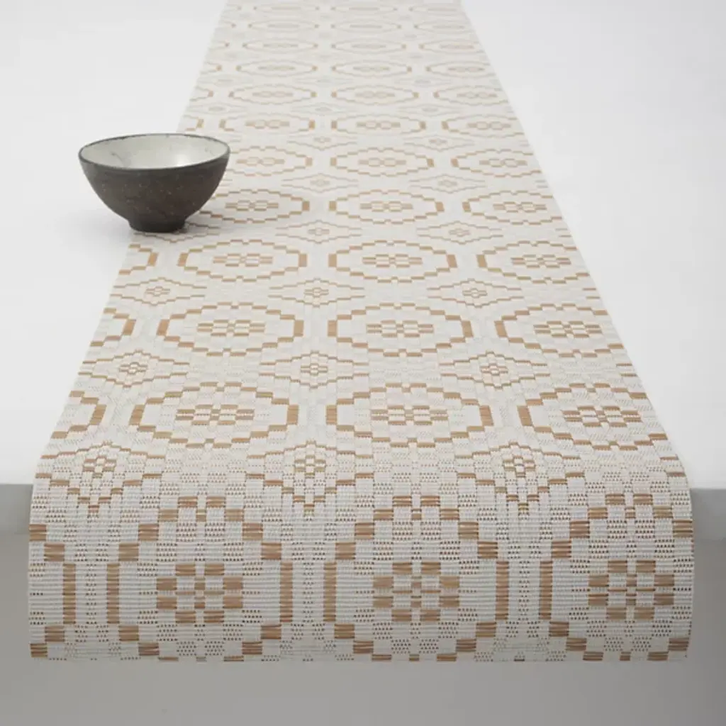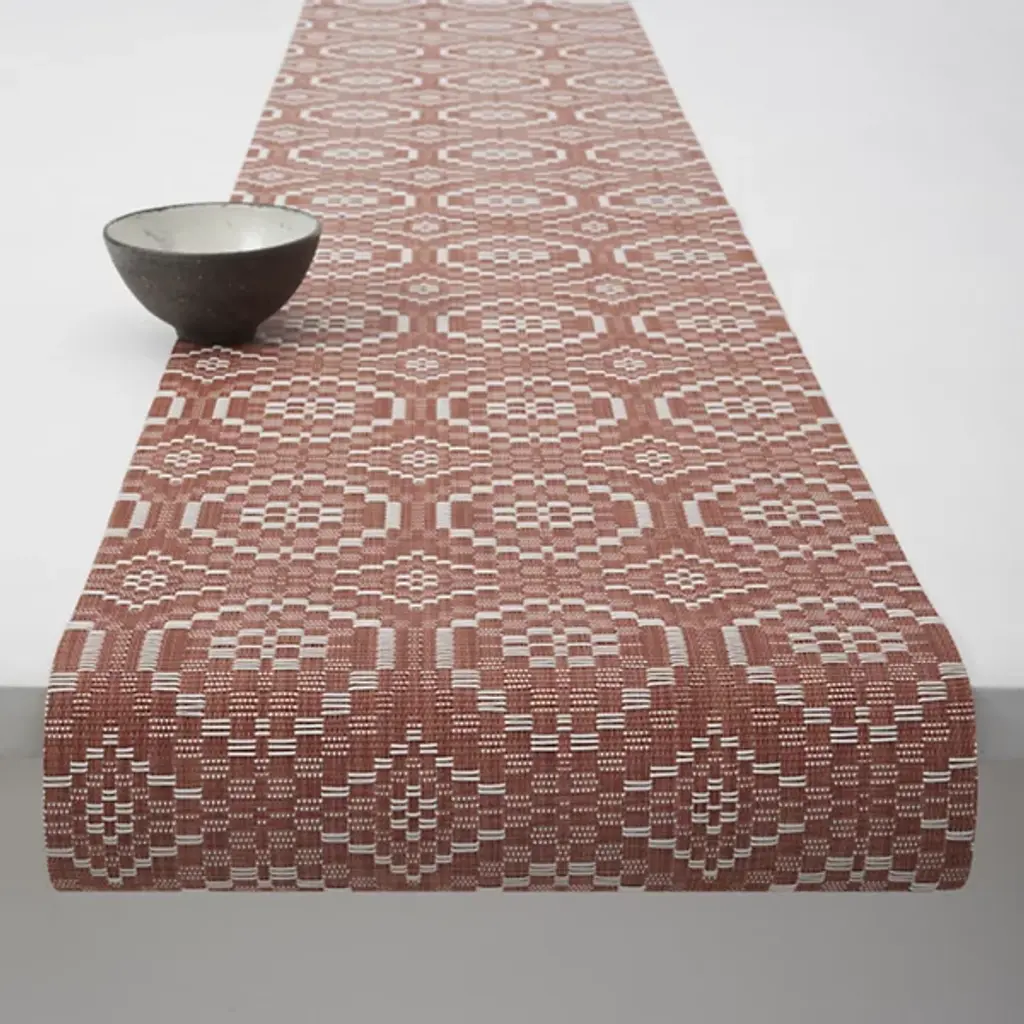 The Overshot Table Runner is presented by Chilewich. The repeating geometric pattern adorning this runner evokes the aesthetic of vintage ceramic tilework, instantly capturing attention and adding elegance to any dining setting. Expertly crafted from the signature Terrastrand weave, this table runner combines impeccable craftsmanship with durability, ensuring it withstands the test of time