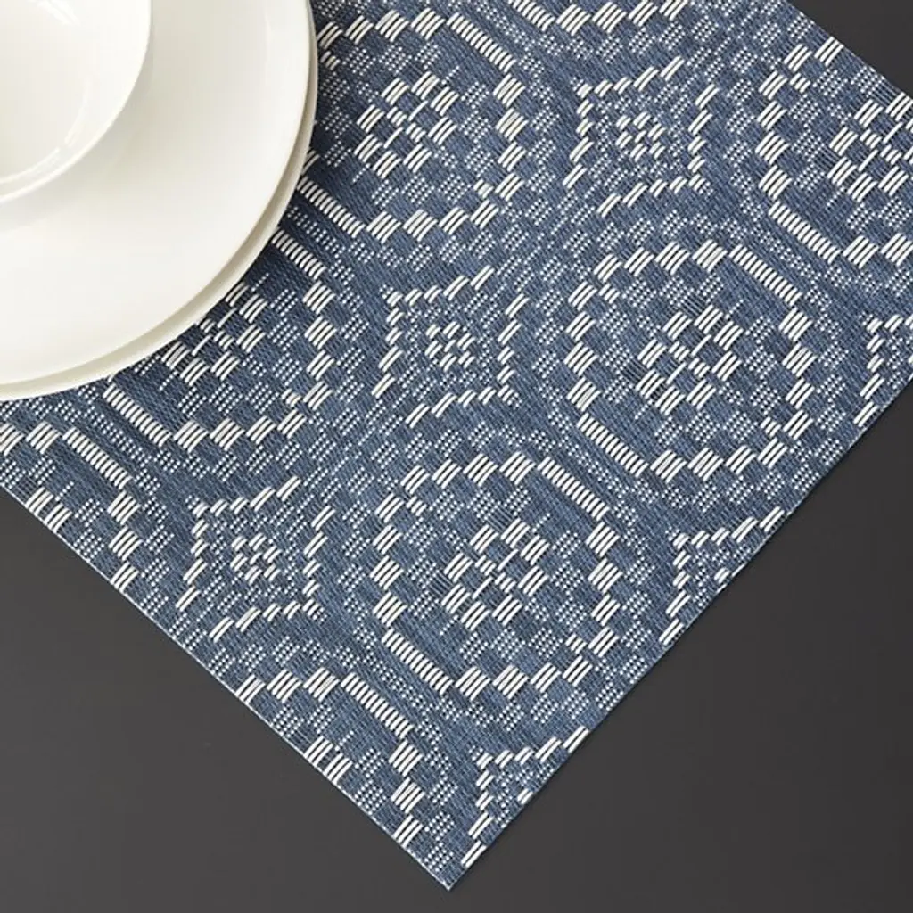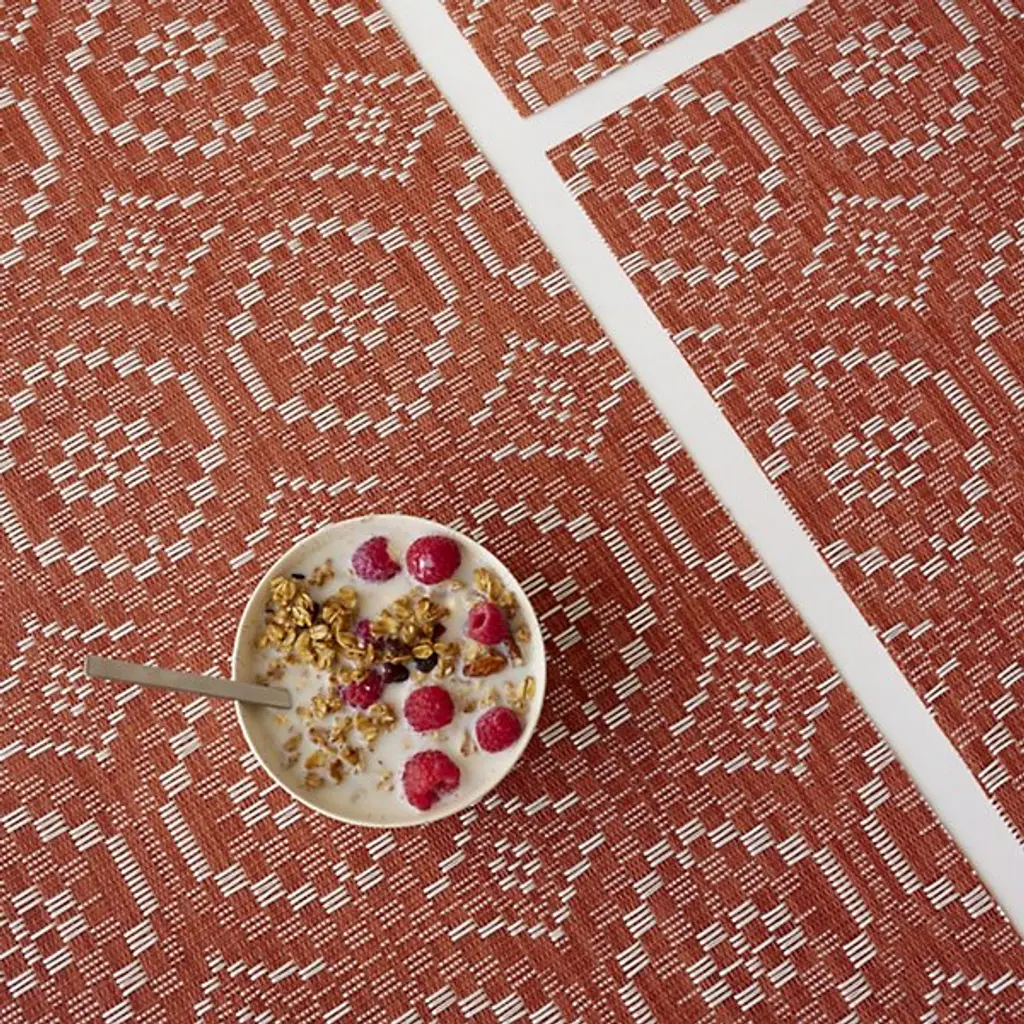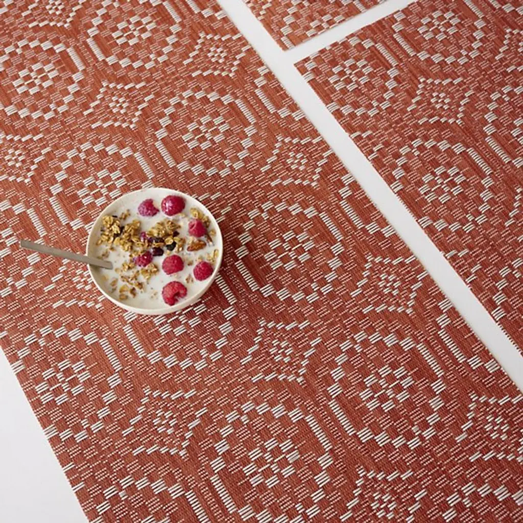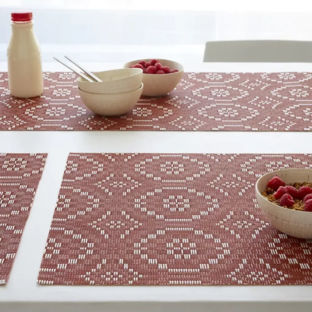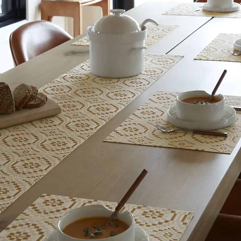 The Overshot Table Runner is presented by Chilewich. The repeating geometric pattern adorning this runner evokes the aesthetic of vintage ceramic tilework, instantly capturing attention and adding elegance to any dining setting. Expertly crafted from the signature Terrastrand weave, this table runner combines impeccable craftsmanship with durability, ensuring it withstands the test of time