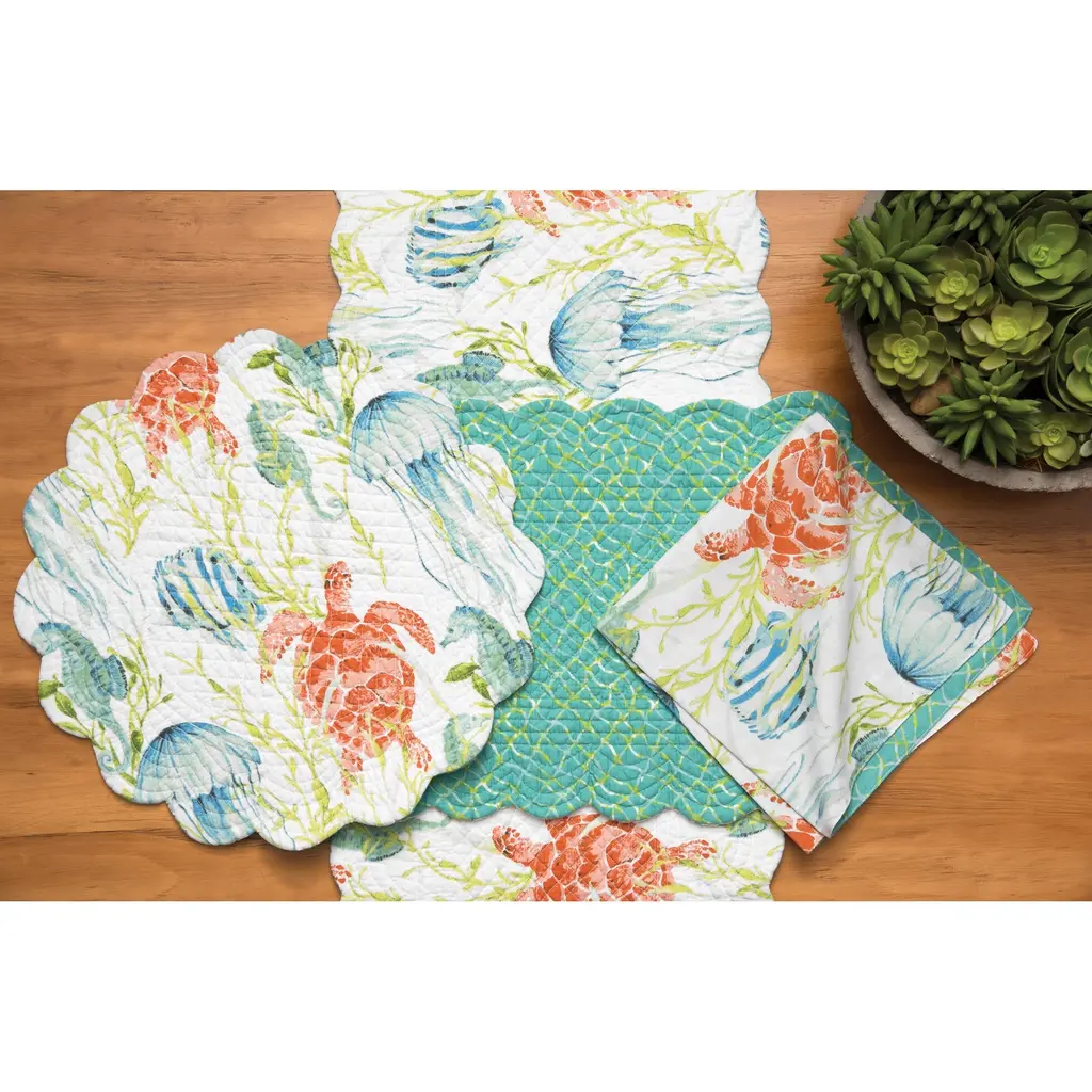 Take a vacation at Paradise Sound with this table runner. A vibrant watercolor design of blue, green and orange undersea creatures gives the room a touch of tropical life, and reverses to a coordinating net pattern that is perfect for lounging on a summer evening.