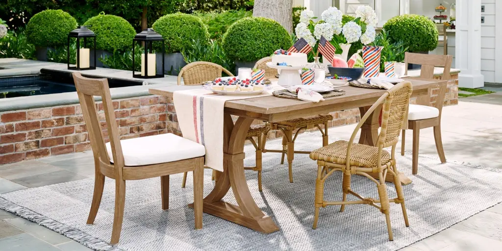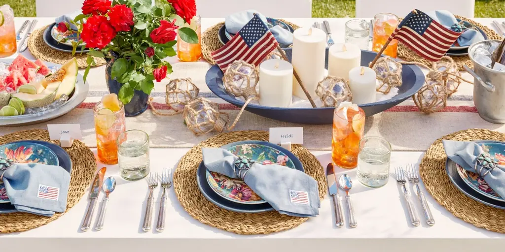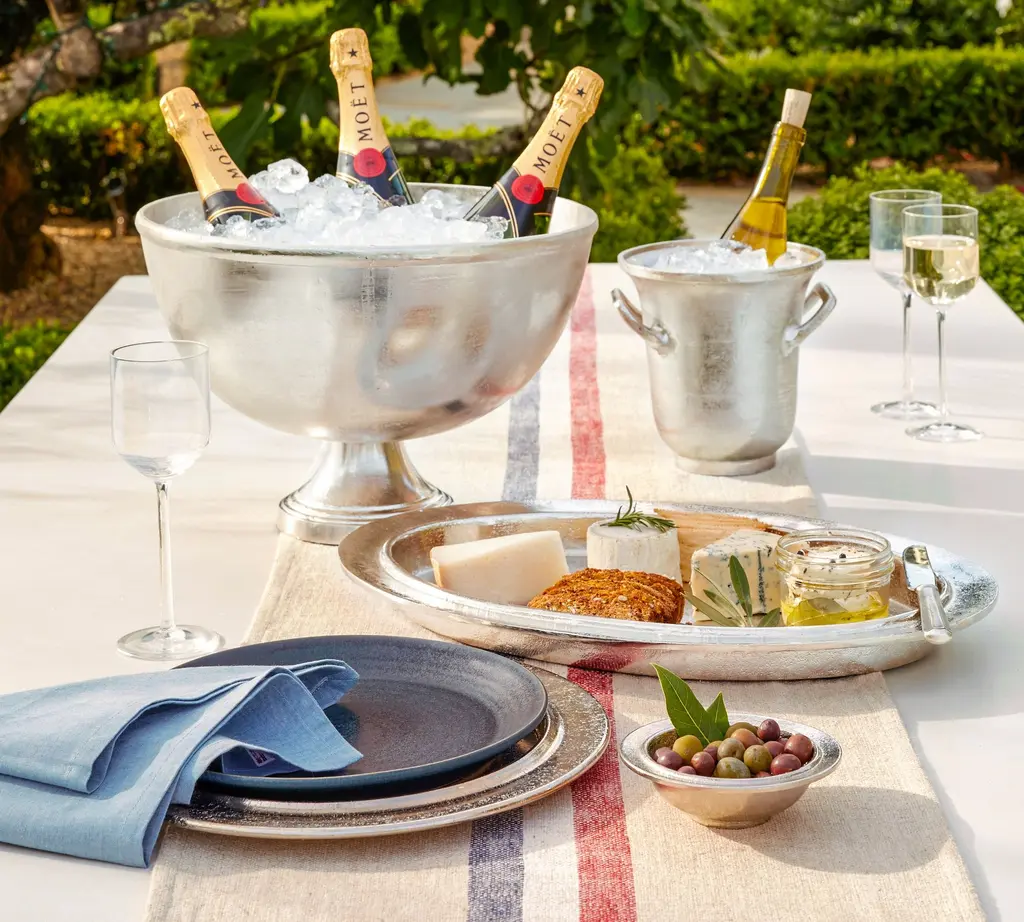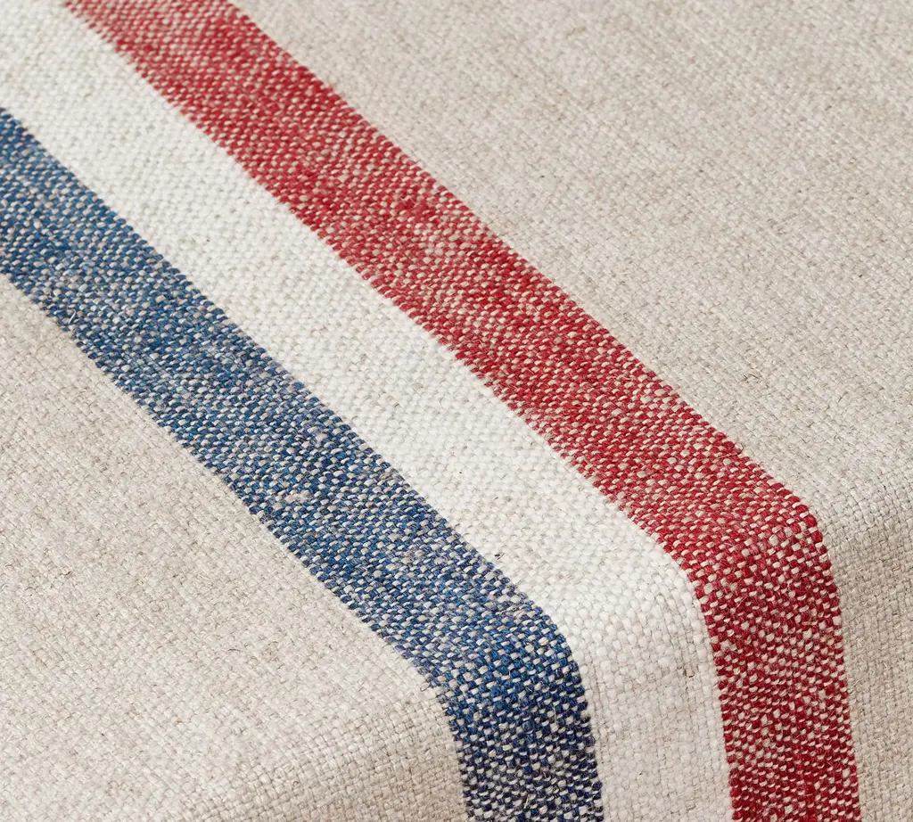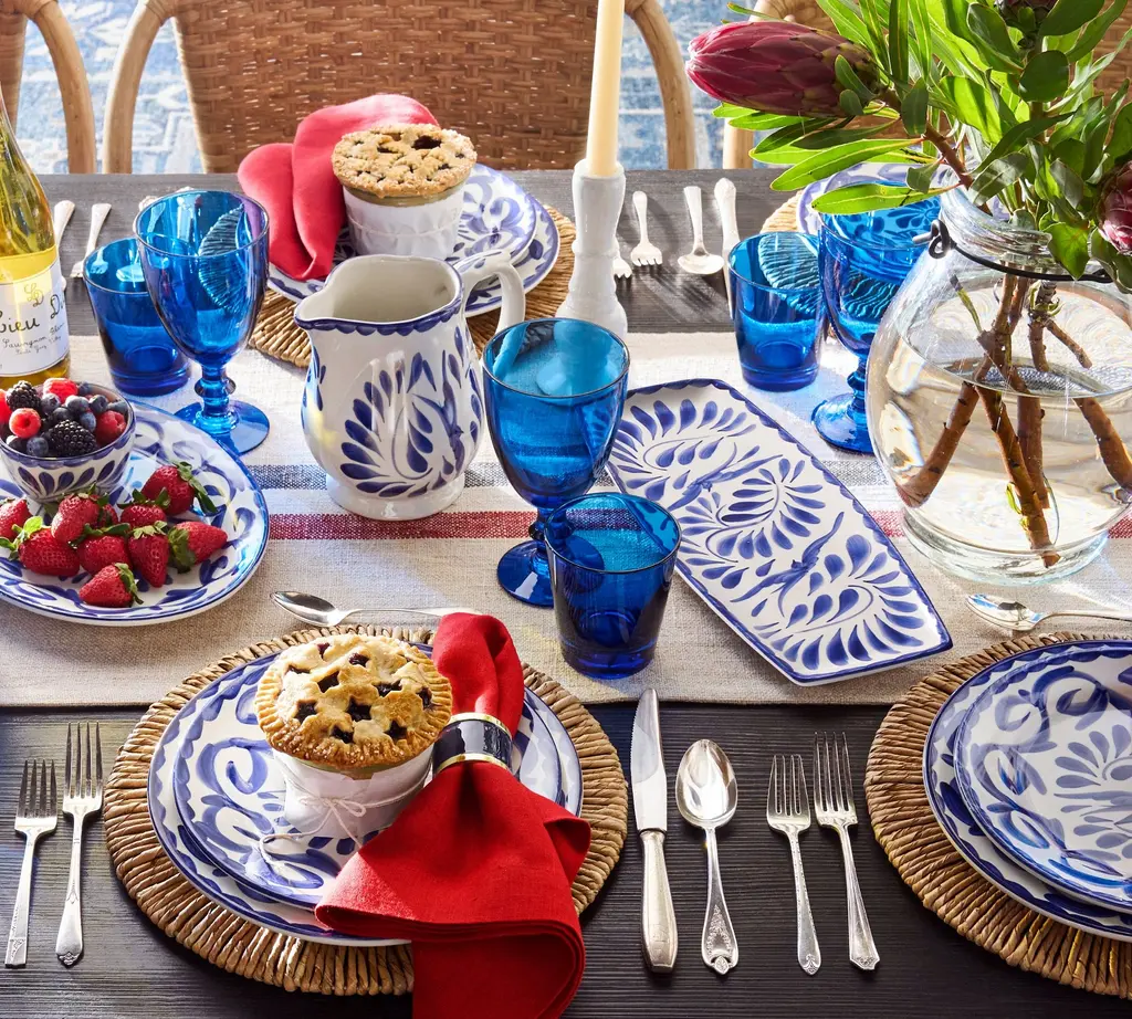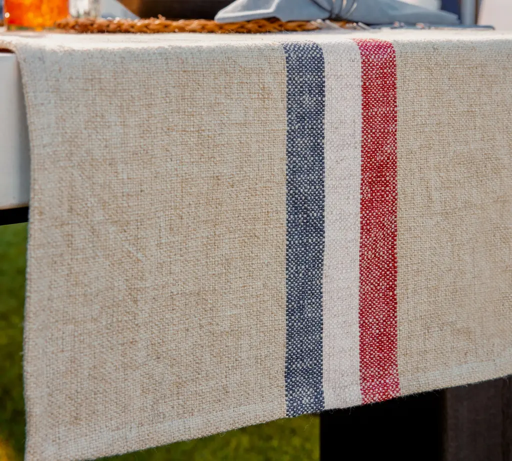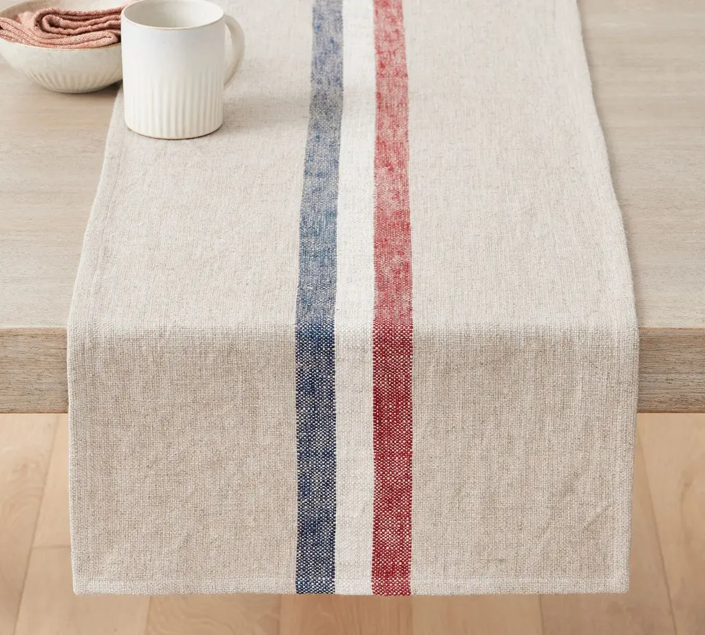 A stripe with three of summer’s most celebratory colors on a natural background reflects the casual sense of celebration we love to see at a table. Layer it with woven organic placemats and a rich punch of colored stoneware for a winning mix of tone and texture.