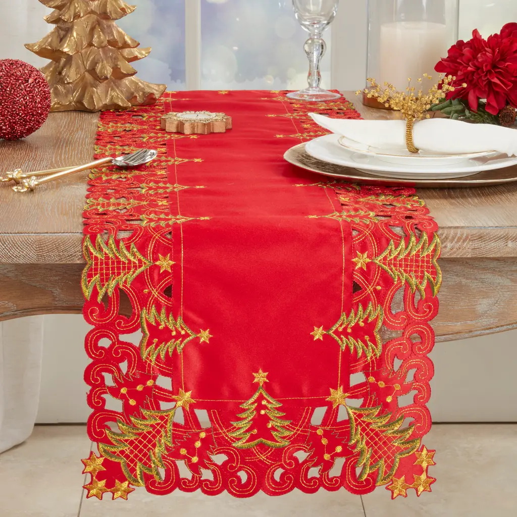 Give your holiday dinner table a festive and elegant look with this Christmas tree design table runner. Featuring a design with a familiar holiday theme, the embroidered golden stars also add a sparkling touch. Create a special setting for either family gatherings or holiday dinner parties and complete your table with coordinating dinnerware and accents.