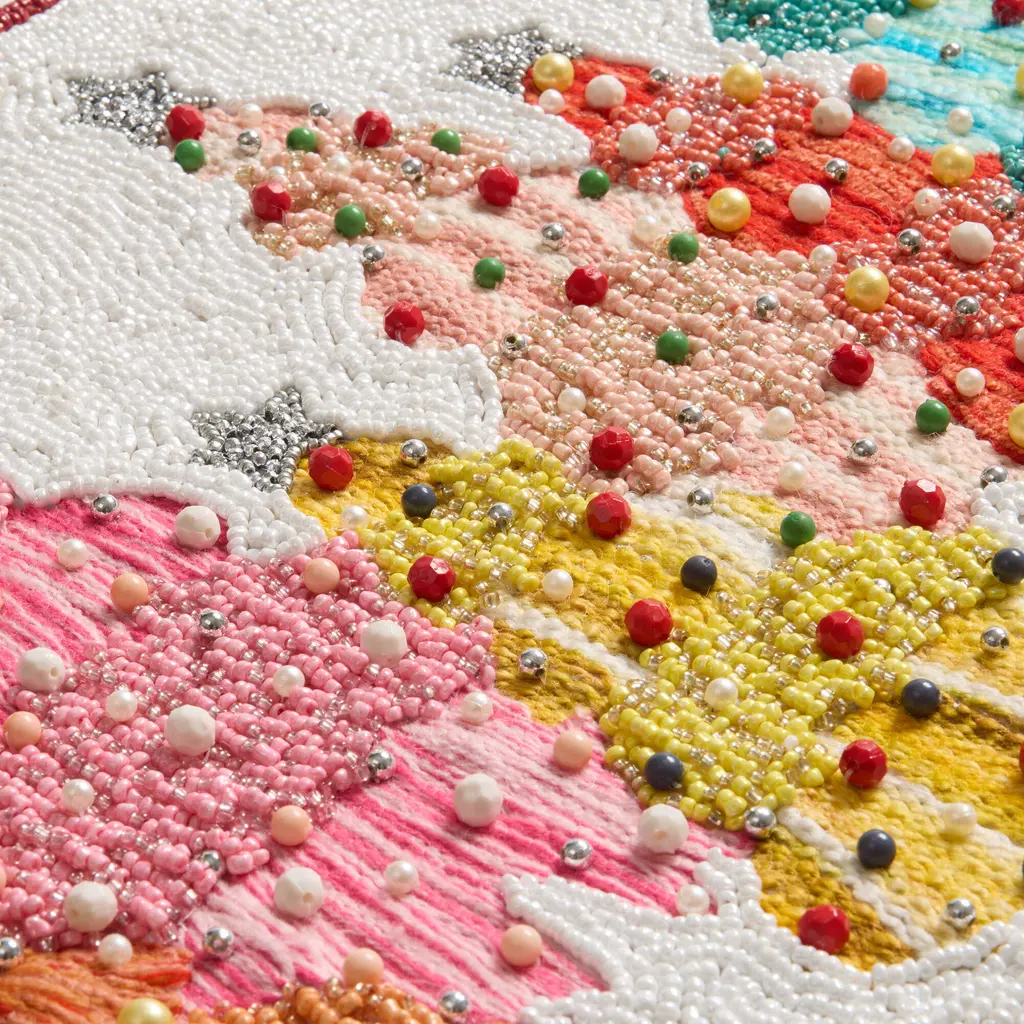 Bring a sense of wonderment and whimsy to your table with our beaded topper, featuring rainbow pine trees with silver star toppers on a pearlescent ground. Handcrafted in India with an array of glass beads and mixed-yarn embroidery, it makes an oh-so-cheerful addition to your Christmas feast. Browse our faux greenery, candles, decor and more to effortlessly create a custom centerpiece with this fan-favorite short runner.