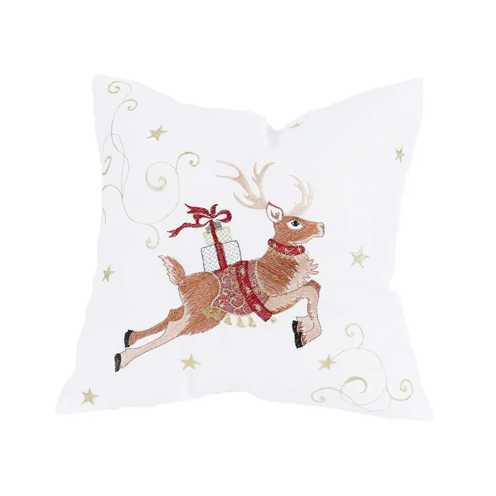 Lively reindeer running with gifts bringing Merry Christmas cheer back to its home and yours! This collection creates a warm and festive setting for your holiday meals and gatherings! Make this appealing for any Christmas holiday setting. As your definitive home décor destination, we feels that every day should be lived fashionably! Our distinctive designs, rich details, and tempting accessories are sure to endlessly fulfill your home's finicky fashion sense. Whether you are keeping up with the ever changing colors of the holidays and seasons, looking for a stunning piece to tie your existing interior décor together while staying in tune with your individual style, or simply in need of an easy care focal point for an upcoming party or event, Xia Home Fashions and Manor Luxe has stylish creations that will complete your look and win complements at your next gathering!, Lively reindeer running with gifts embroidered with golden ribbon and stars. Double layers. Reversible use, reverse side is solid color. , Different length available.36", 70" and 90", Made with easy care polyester. Machine Washable , Matching Pillow, Placemats and Table Runners available., Perfectly accented with these warm and inviting holiday decorations!