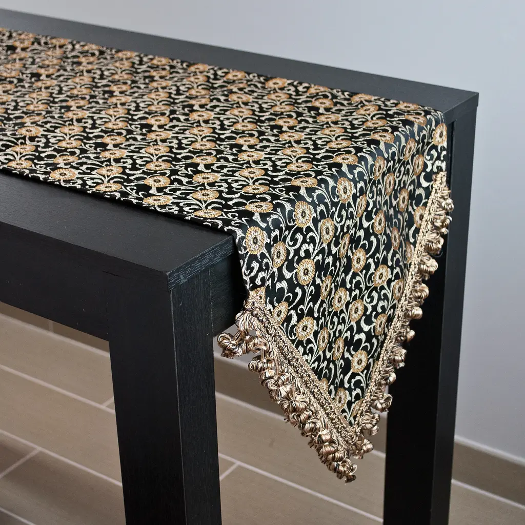 Elongate the appearance of your dining table with this Sherry Kline Fairmont table runner. The black background offers a dramatic contrast to the rich gold embellishments on this traditional-style table runner, and soft polyester fibers enrich your tablescape while offering durability and allowing this runner to be machine washable for easy care. Material: Polyester Style: Traditional Season or Holiday: All Seasons, Mother's Day, New Year's Day, Father's Day, Winter Care Instruction: Machine Wash Shape: Runner Exact Color: Multi-color Color: Black, Gold