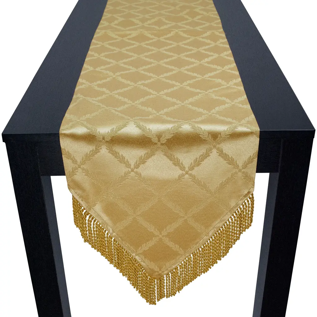Showcase your favorite table with this sumptuous table runner from Sherry Kline.Beautiful and sophisticated jacquard table runner. This table runner features a Diamond pattern with a stylish brush fringe and a scallop edge which adds elegance and style to your table. Crafted from an imported durable polyester, this runner is easily spot cleaned for convenient maintenance. This accessory is available in three different sizes so you can be sure to get the one that fits your preferred style.The digital images we display have the most accurate color possible. However, due to differences in computer monitors, we cannot be responsible for variations in color between the actual product and your screen.