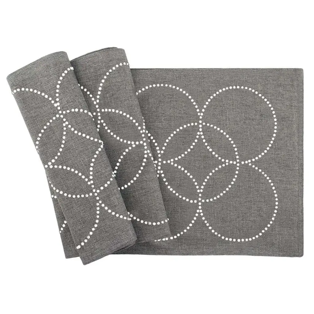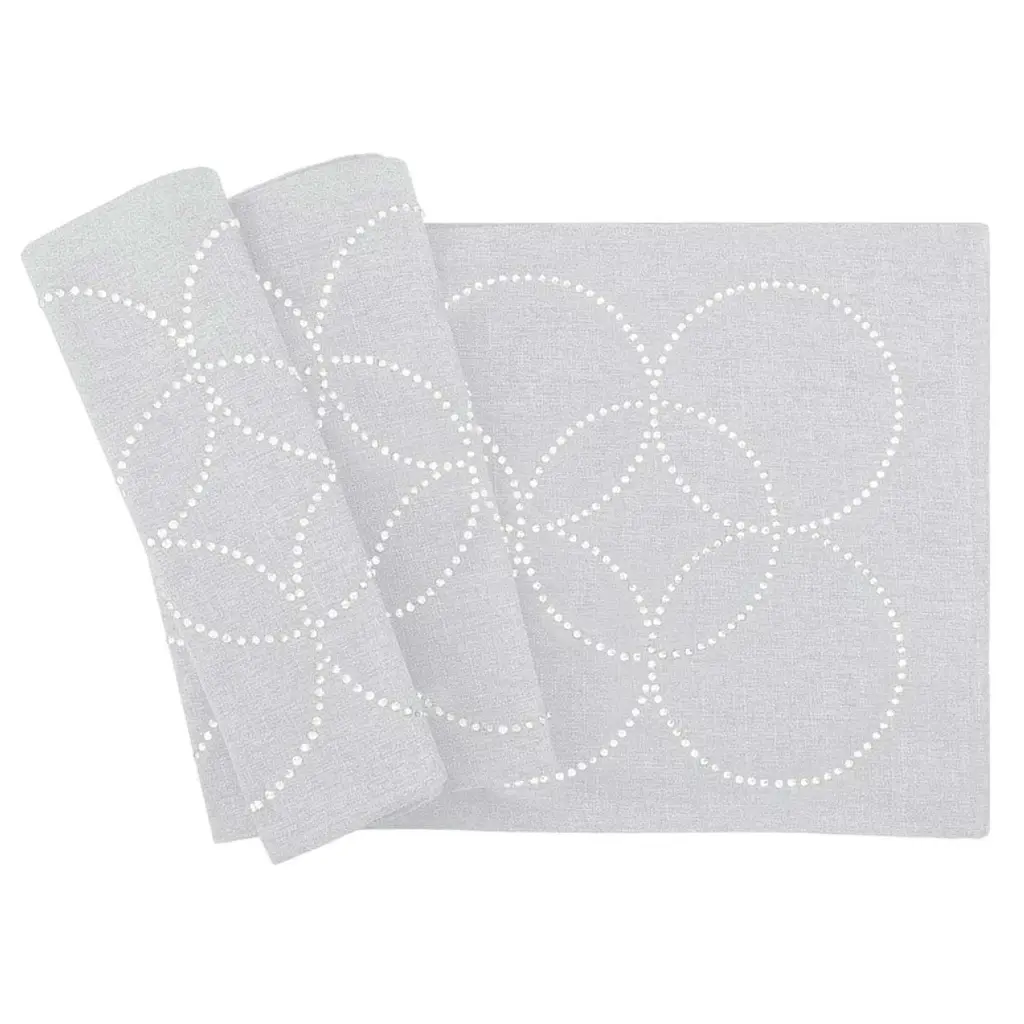 This table runner utilizes the same fabric, design, and color options of the corresponding placemat to complete the look. These table runners are set with crystal rhinestones are also machine washable. Available in several sizes.