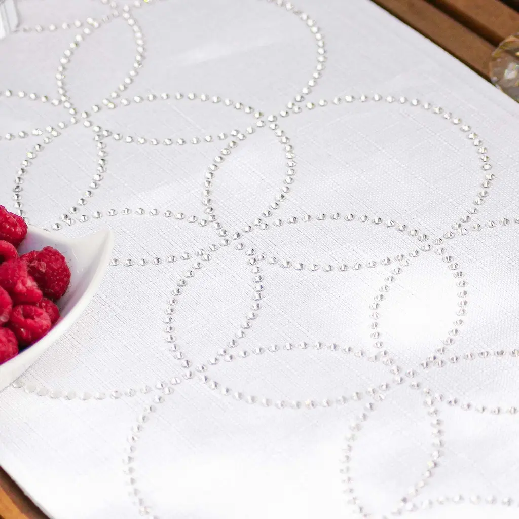 This table runner utilizes the same fabric, design, and color options of the corresponding placemat to complete the look. These table runners are set with crystal rhinestones are also machine washable. Available in several sizes.