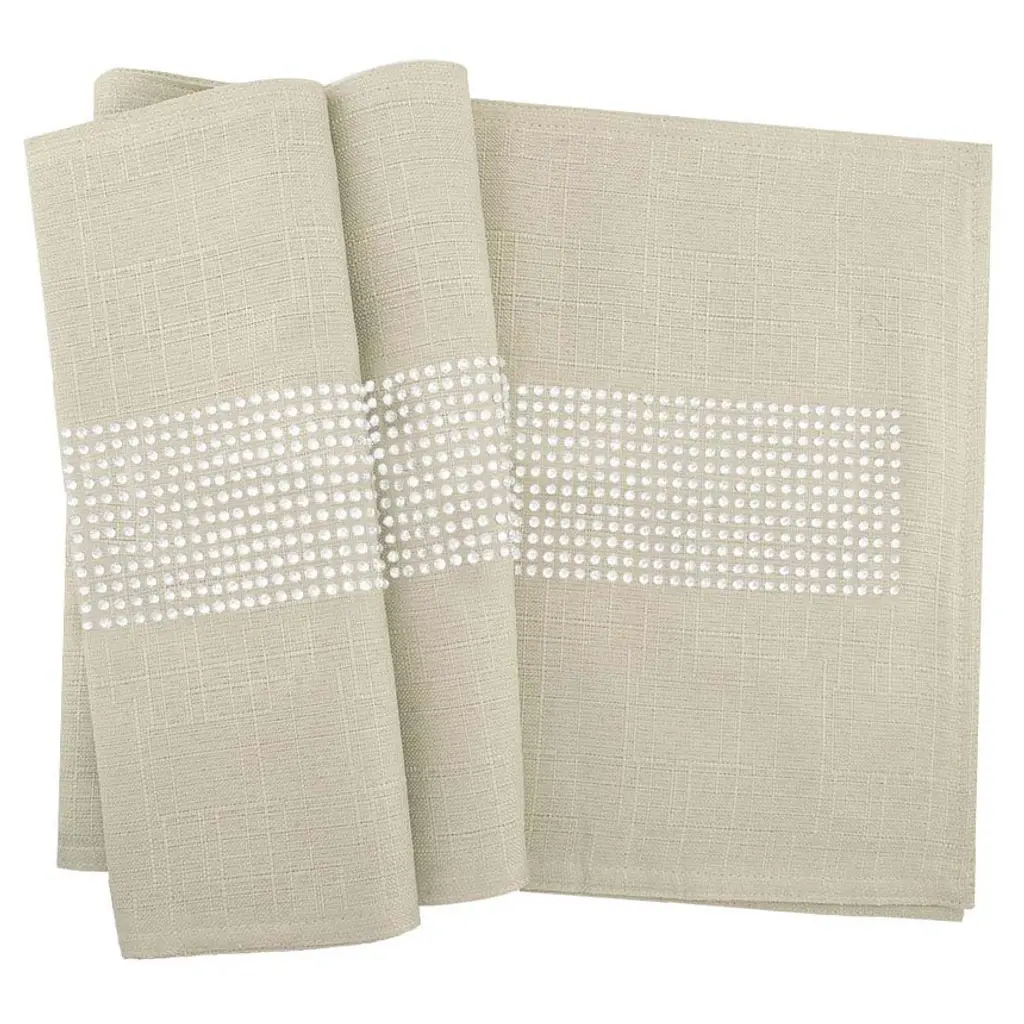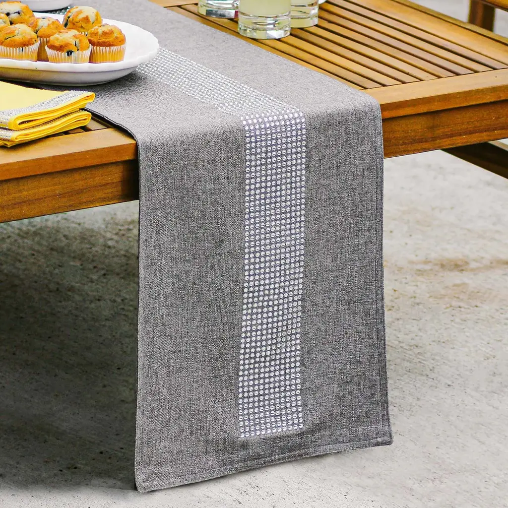 This table runner utilizes the same fabric, design, and color options of the corresponding placemat to complete the look. These table runners are set with crystal rhinestones are also machine washable. Available in several sizes.