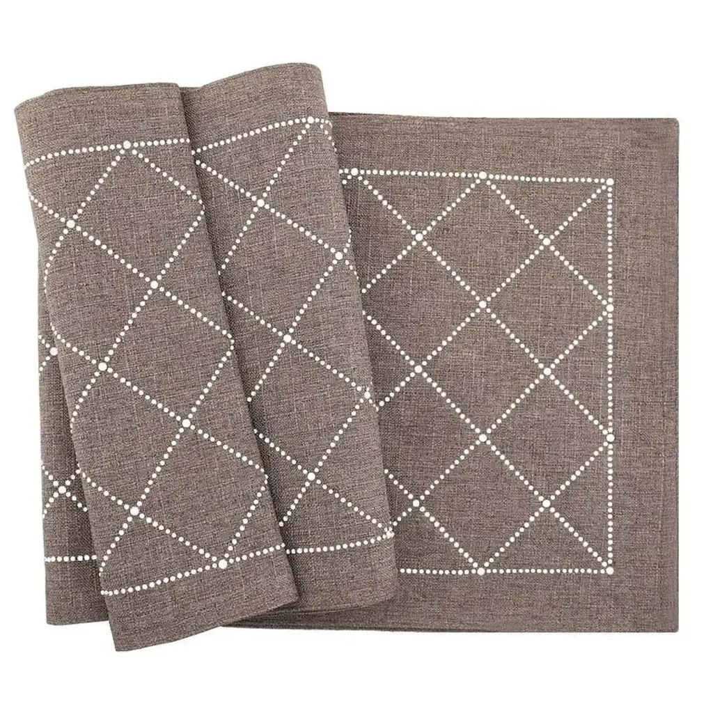 This table runner utilizes the same fabric, design, and color options of the corresponding placemat to complete the look. These table runners are set with crystal rhinestones are also machine washable. Available in several sizes.