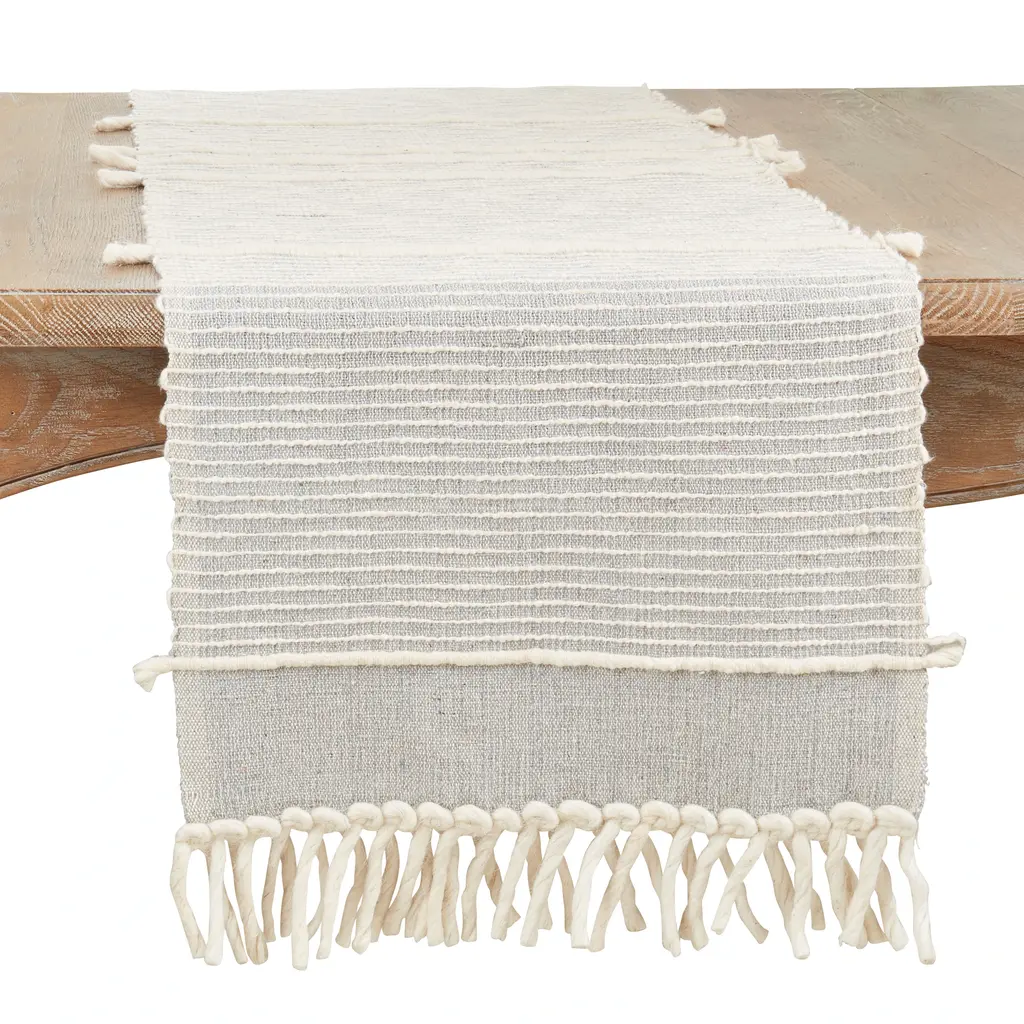 This eye-catching Striped Chunky Fringe Table Runner is a wonderful addition to your dining table décor. It features a dual tone design that brings beautiful texture to the table and chunky tassels that add a whimsical note. The runner pairs well with solid color placemats and table napkins within the same palette.Features: