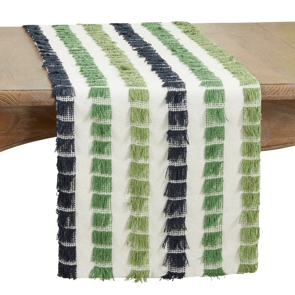 Perfect for Spring or Summer décor, the Striped Fringe Table Runner is a light, cheerful backdrop for your tabletop. It brings color, texture and dimension to your table, and it's easy to pair with a wide range of dinnerware. Made with 100% cotton, the table runner is soft and durable.Features: