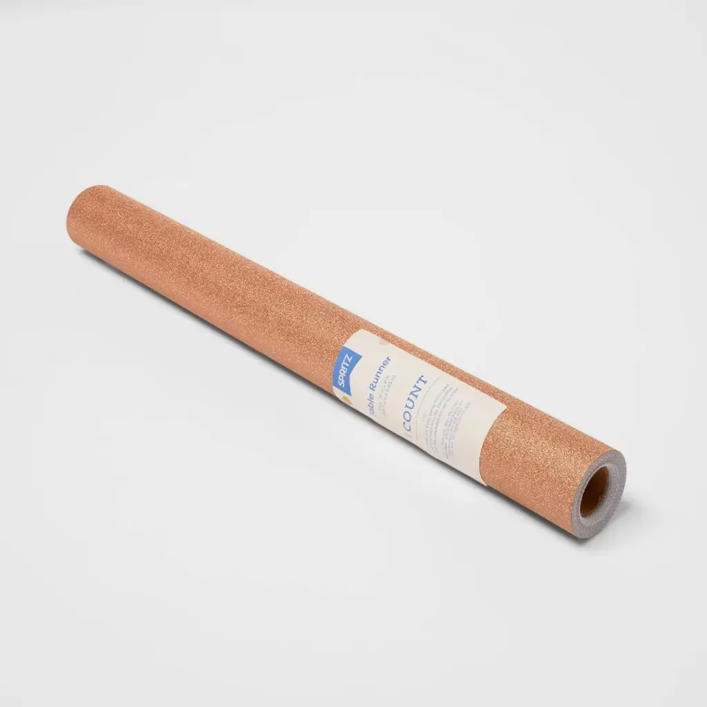 Dress up your table in an instant with the Rose Gold Table Runner from Spritz™. This plastic table runner pops in a rose-gold hue with a glittery finish that'll make your table shine — perfect whether you're decorating for a special event or just want to add a little pizzazz to a mid-week dinner. The sleek plastic construction makes it easy to wipe up spills so you can reuse the decorative table runner, but the table runner is also disposable so you can toss it away if it gets too messy. Stretching eight feet, the glittery table runner fits large tables and can easily be folded or trimmed to fit smaller ones. Spritz™: Pops of joy that make the moment™