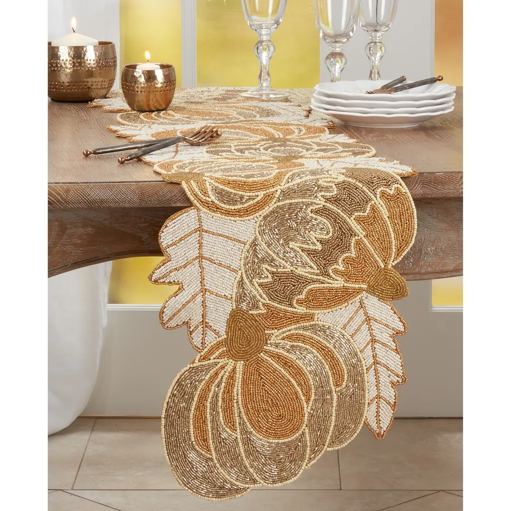 Take your fall décor to the next level with this charming Beaded Pumpkin Table Runner. Made with glass beads which catch and reflect the light, the runner brings a glittery note to the table and works well as an "always-on" accent piece. You can pair it with pumpkin placemats, as well as solid colors within the same palette.Features: