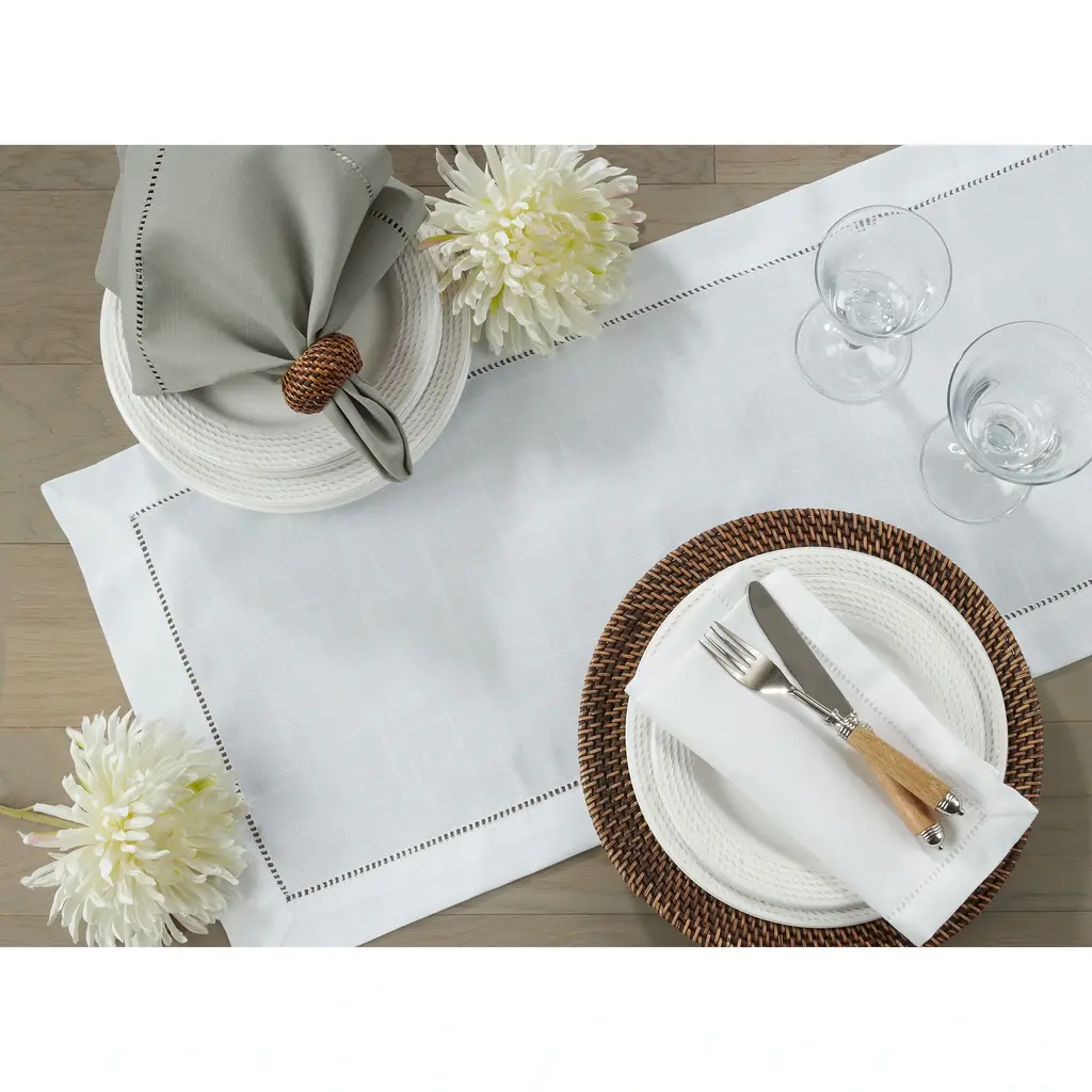 If you're looking for a simple, yet stylish and classic backdrop for your table décor, then you can't miss the mark with this beautiful Hemstitched Border Table Runner. Its crisp design makes it highly versatile and easy to pair with a. wide range of dinnerware and table linens. For a coordinated look, you can pair it with matching placemats and dinner napkins.Features: