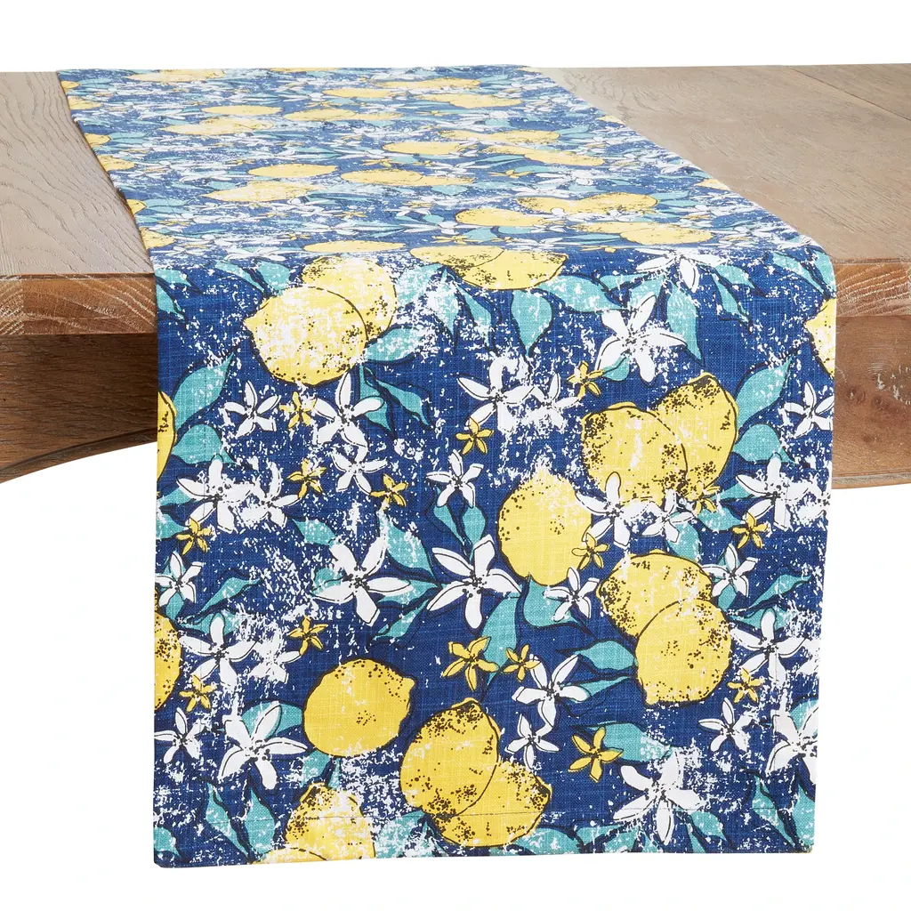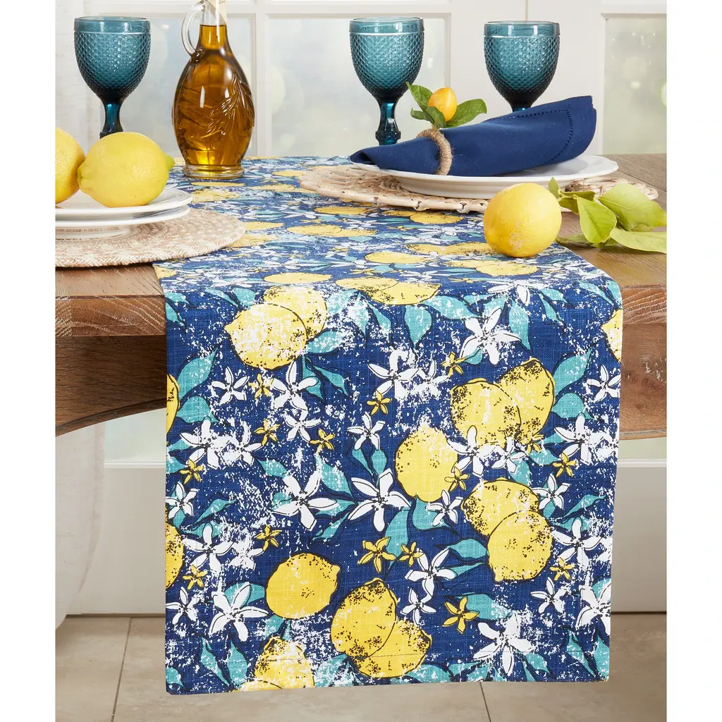 This bright and stylish Lemon Design Table Runner is the ideal backdrop for your spring or summer table décor. Its rich design and vibrant colors liven up the space, while the bright yellow lemons sparkle against the dark navy blue background. Soft and durable, the runner is made with 100% cotton.Features: