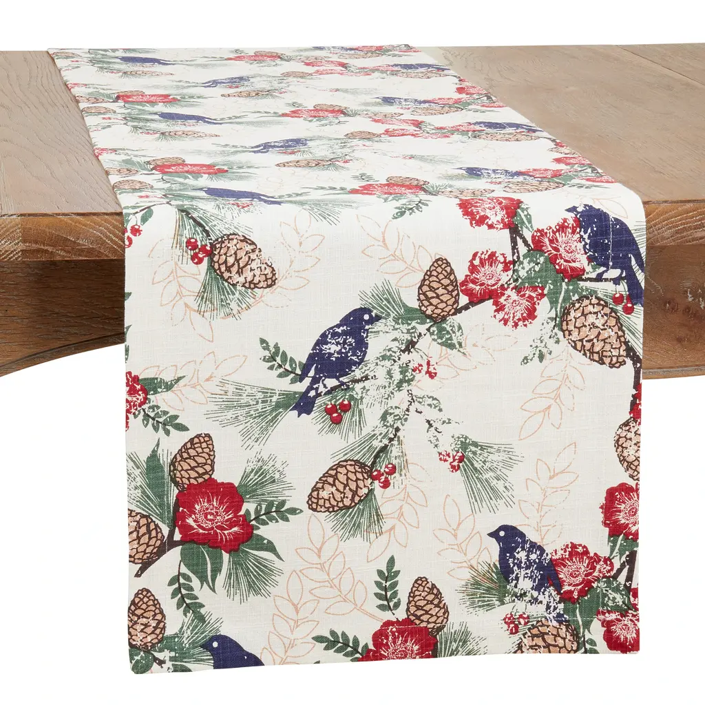 The perfect backdrop for your dining table, this utterly charming Pinecones and Birds Table Runner adds texture, depth and dimension to the décor. Inspired by nature and made with 100% quality cotton, the runner brings a natural look and feel to the tabletop. Pair it with matching placemats and dinner napkins for a coordinated look.Features: