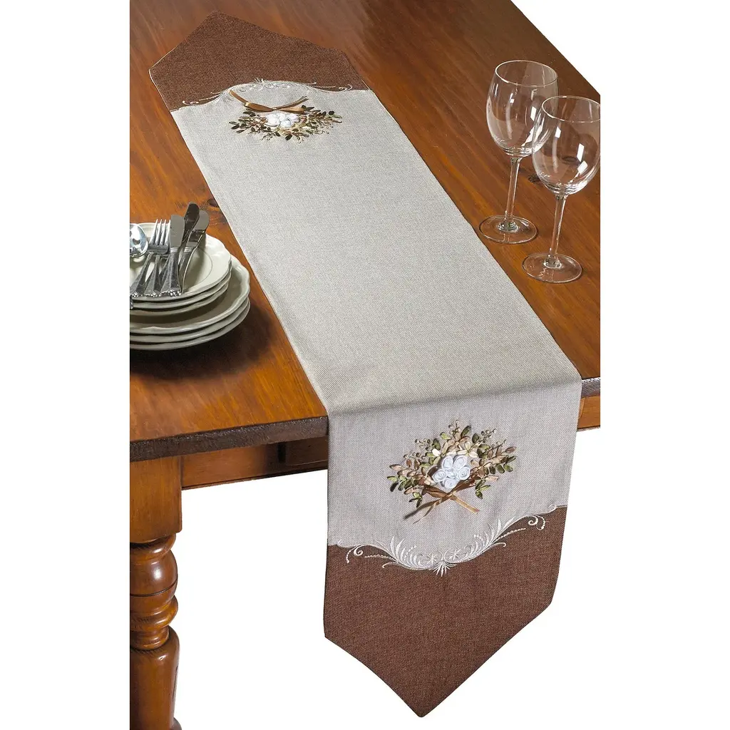 Violet Linen Decorative Artistic Burlap Embroidered Table Runner - 13" X 70" - Brown