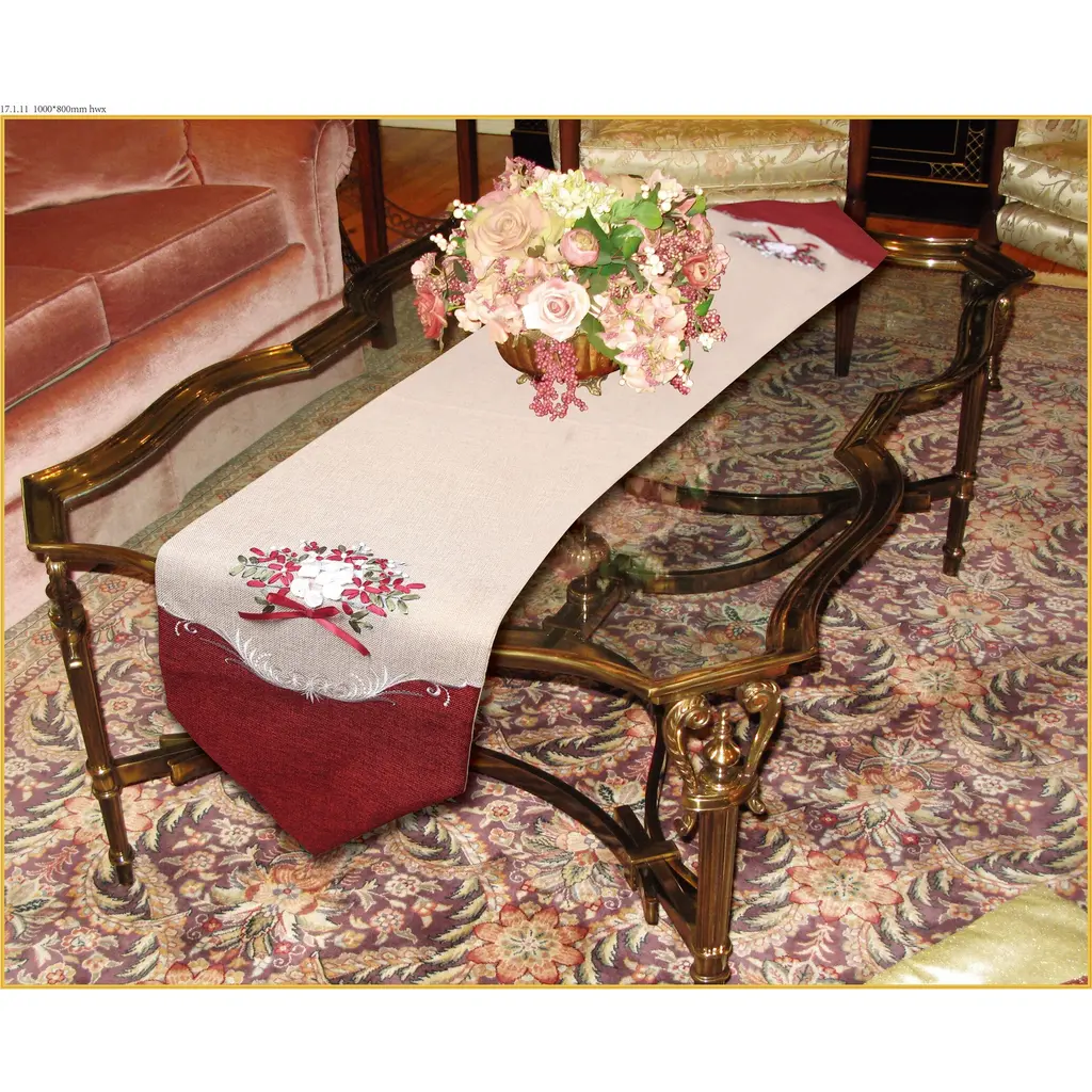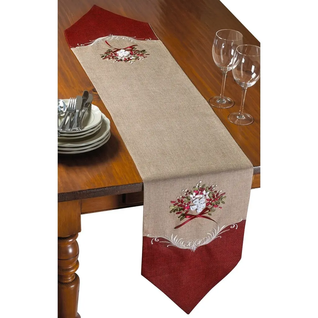 Violet Linen Decorative Artistic Burlap Embroidered Table Runner - 13" X 70" - Burgundy