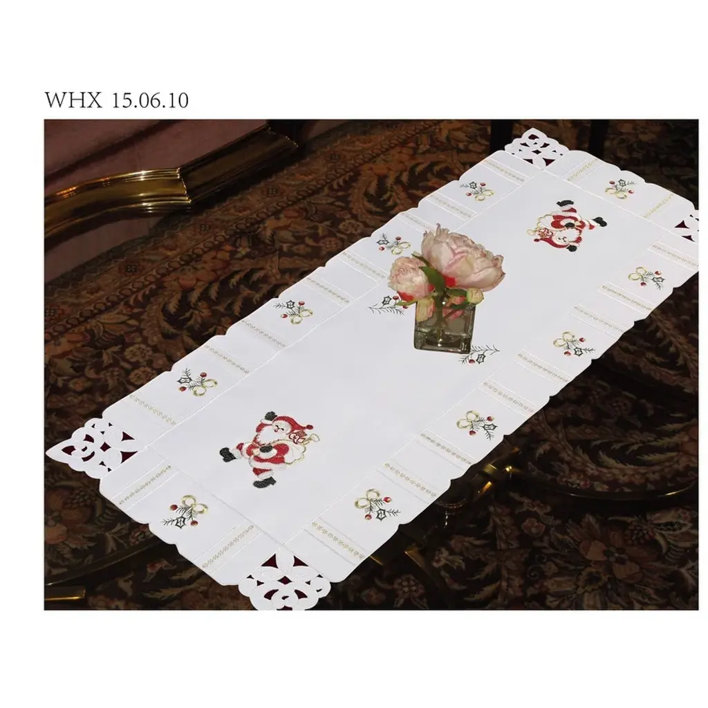 Violet Linen Santa Claus Holly Bows Embroidery Pattern Table Runner - 14" X 54" - White