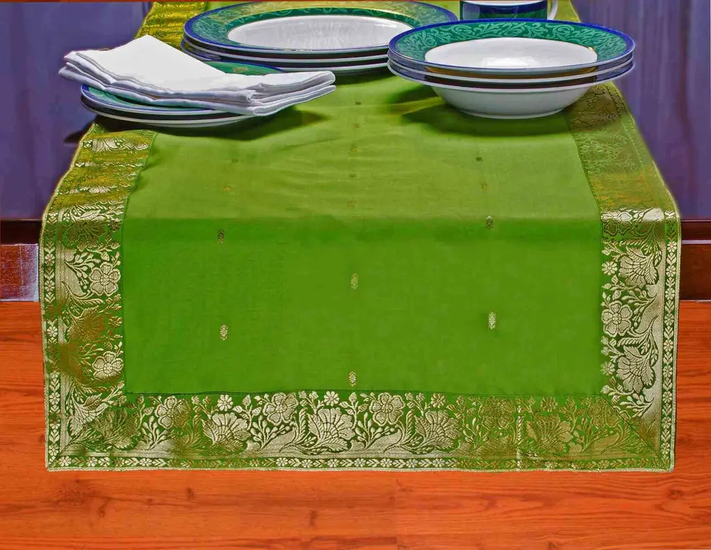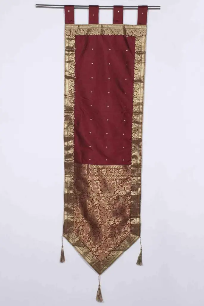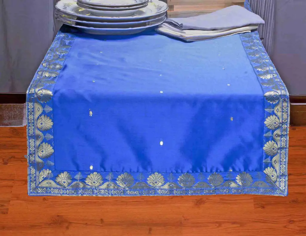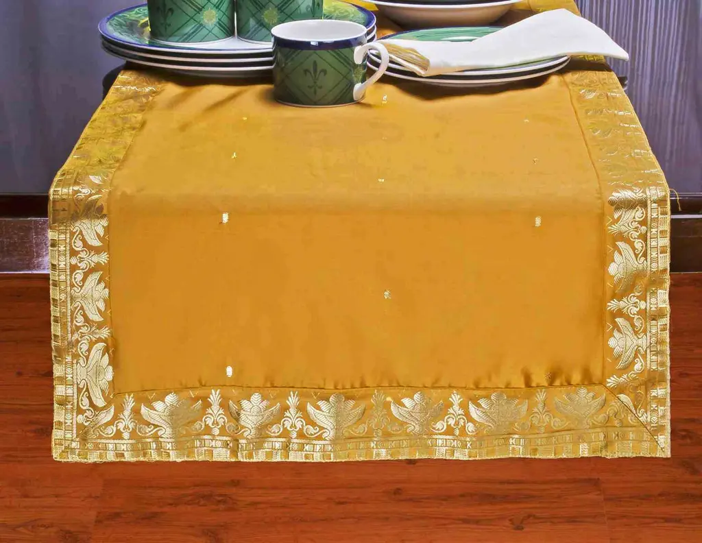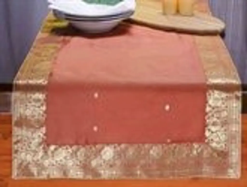 Give your table some charisma and charm with our Sari Table Runner. Hand Crafted in India, pick up this Indian Selections exclusive today. Use it in your home or if have an indian theme party / wedding just slip it on and see how it lights up the room. Our Hand Crafted Sari Tapestry Table Runners look like a priceless family heirloom. Richly textured design draws its inspiration from the colors of India. Introduce an ambiance of refined elegance to your dining space with our exquisite Indian Sari table runner. Crafted with a lavish golden floral pattern that radiates opulence, the runner is further enhanced by the soft glow of strategically placed sequins. The delicate background offers a serene contrast, making it a versatile piece that complements a wide range of tableware. Perfect for any dining occasion, this runner truly transforms your table setting into a work of art. Stylish Dining With Enhanced Durability Elevate your dining experiences with our poly art silk sari diwali table runner. This exquisite table runner is expertly crafted from high-quality poly art silk sari fabric, exuding a sense of luxury and refined aesthetics. The blend of polyester ensures enduring durability and simple maintenance. Our bohemian table runner is machine washable, allowing you to easily uphold its vibrant colors and rich texture without needing costly dry cleaning, making it a practical choice. Versatile And Perfect Gift Choice Transform your table with our versatile 18 x 108-inch Handcrafted boho runner for table, tailored to suit a variety of table sizes. It is enhanced with a coordinating lining, which exudes a polished look ideal for special occasions like Indian-themed parties or weddings. This handcrafted masterpiece makes an ideal gift. Whether celebrating a housewarming, wedding, anniversary, or any special occasion, the asian table runner is a heartfelt token for those who relish culturally-inspired decor, symbolizing your appreciation for their unique taste. Search Terms: quilted embroidered, placemats, dresser, colorful, beige, buddhist, hippie, cloth, decoration, pooja, short, southwestern, lined, tapestry, inches, long, table, house, decorations