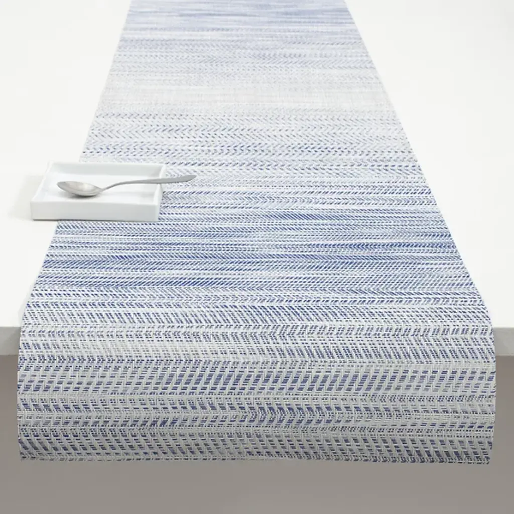 Spill a cool, watery accent across a tabletop indoors or out with the Chilewich Wave Table Runner. It begins with a geometric, irregular herringbone pattern, which is then over-woven with white TerraStrand vinyl yarns to create the final slightly faded look.