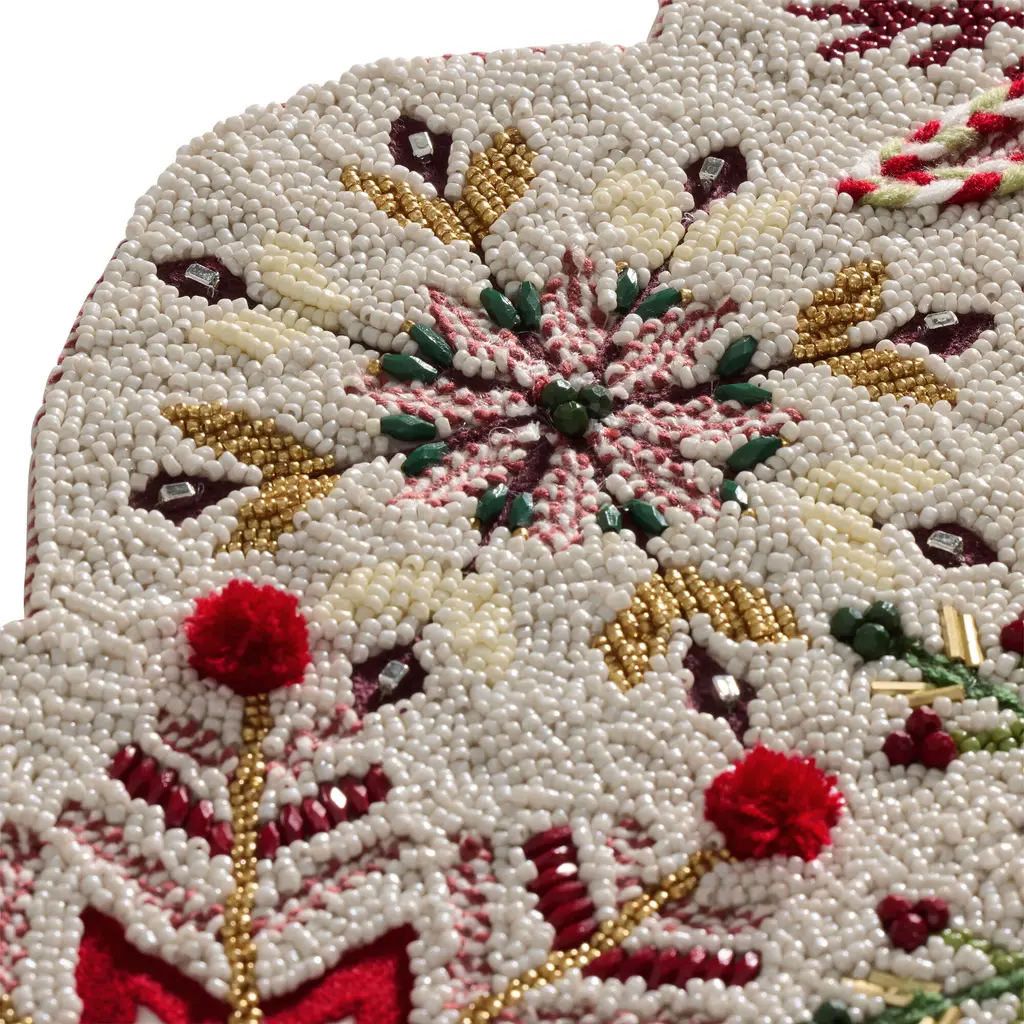 May your meals be merry and bright with our exclusive table runner, showcasing a cluster of snowflakes in red, green, gold, and white. Handcrafted in India with a mix of beads, embroidery, pom-poms, and more delightful dimensional details, this short runner sets a festive table for holiday gatherings. A World Market bestseller, our beaded tabletop decor helps you make a standout Christmas centerpiece in a snap.