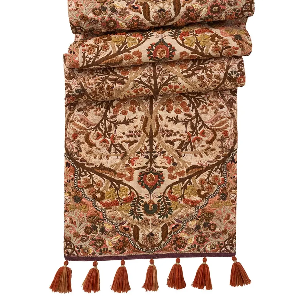 Bring a gorgeous texture to your table with this sumptuous runner inspired by heirloom tapestries. Featuring intricate embroidery throughout and tassels on either end, this runner is stunning dressed up or down, all season long.