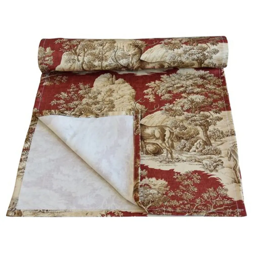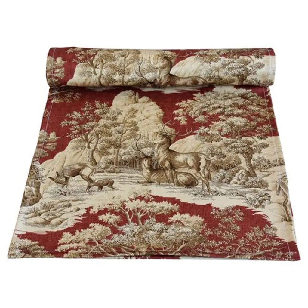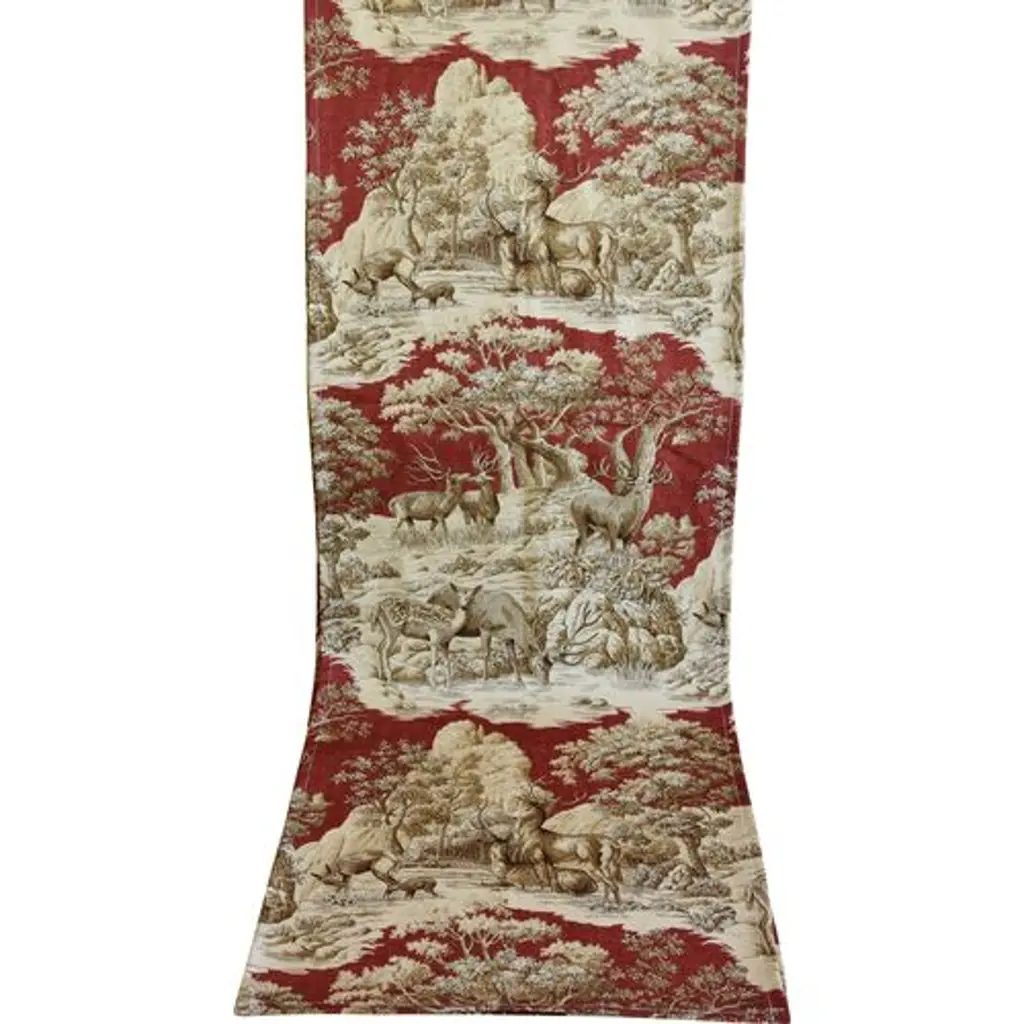 Custom-tailored 110" long table runner created from a toile fabric depicting a beautiful festive woodland nature scene with deer, trees, mountains, and streams. The runner is one continuous piece of fabric with all edges professionally hemmed and finished. The placement of the design may vary according to the fabric cut. No maker's mark. Excellent new unused condition.