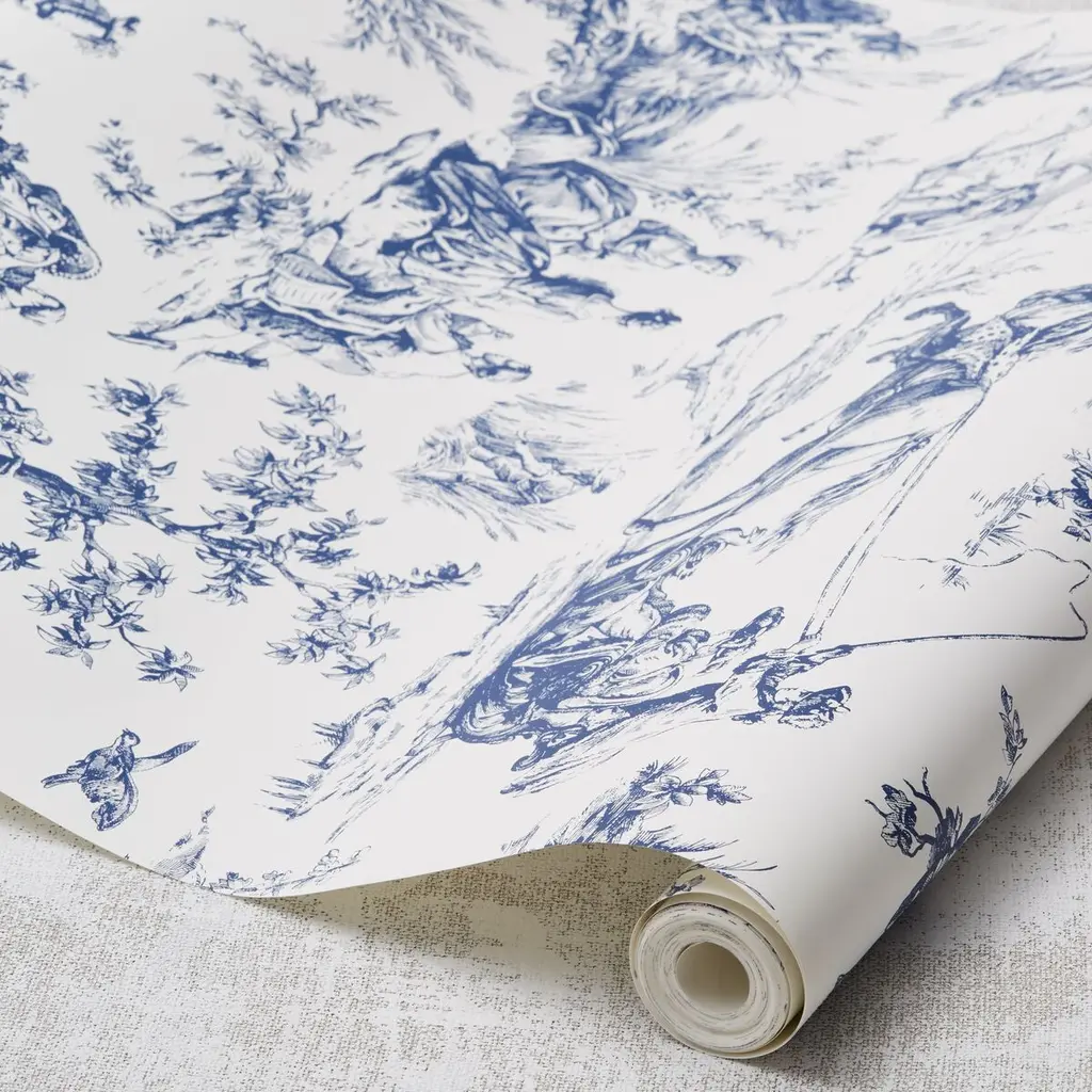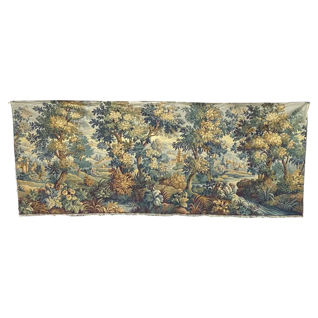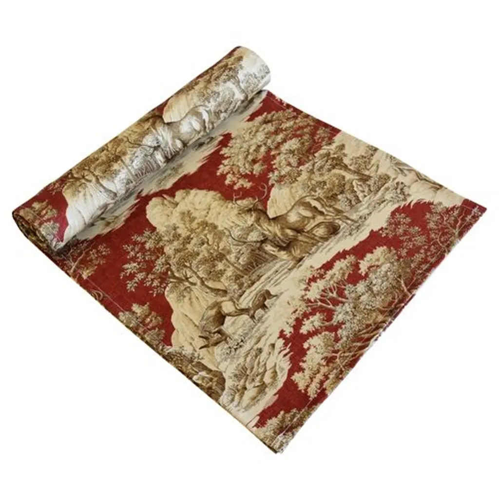 Custom-tailored 110" long table runner created from a toile fabric depicting a beautiful festive woodland nature scene with deer, trees, mountains, and streams. The runner is one continuous piece of fabric with all edges professionally hemmed and finished. The placement of the design may vary according to the fabric cut. No maker's mark. Excellent new unused condition.