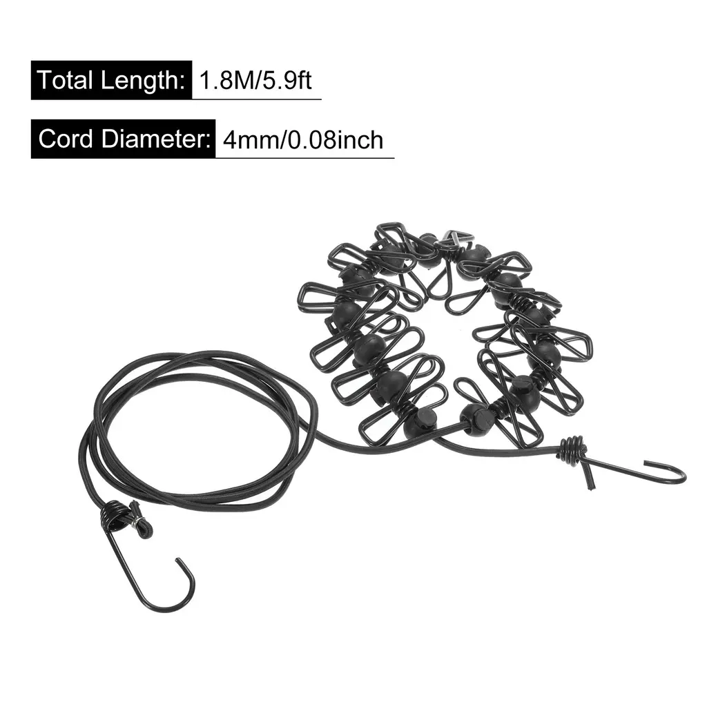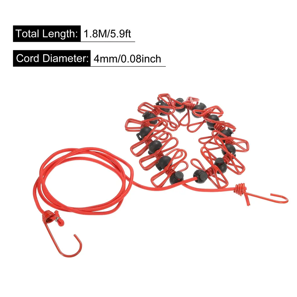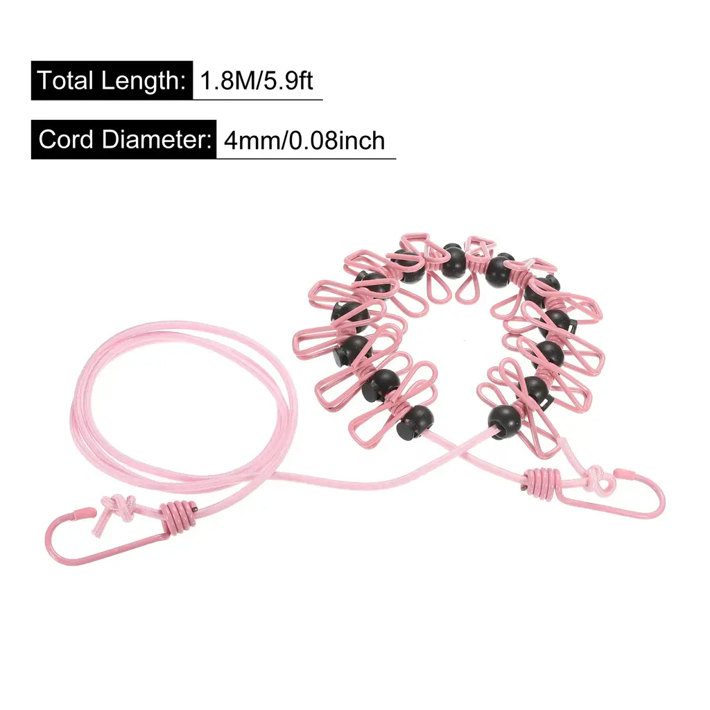 Description:Stretchy Clothesline - Made of multiple strands of elastic rubber band with stretchy and good tenacity. The original length of this clothesline is 1.8M/5.9ft and can be stretched up to 3.4M/11.15ft.Windproof & Portable - Portable clothesline contains 12 clothespins and 13 cord locks to keep your clothes firmly stay on the clothesline even suffer from strong wind and keep clothes from piling up. It is a great choice for outdoor, travel, camping, etc use. Lightweight and no need to prepare extra clothes hangers, save space for your backpack.Flexible Space Use - Easy to store, not occupy space, and flexible install. Comes with metal hooks at both ends which make an instant drying space whenever and wherever you need it.Great Drying Option - The clothesline is easy to fasten with two strong metal hooks. Can be hung up anywhere as long as it withstands the weight of the things you dry: bathroom, balcony, backyard, patio, laundry, hotel, RV, boat or even attached to trees.Wide Application - Strong enough to load up for drying clothes, socks, underwear, bathing suits, towels, scarves, bed sheets, and more. It is a recommended clothesline for family daily use, travel, camping, hiking, outdoor and indoor use.Specification:Material: Rubber Band, PP, IronTotal Length: 1.85M/6.07ftCord Diameter: 4mm/0.08inchPackage Content:3 x Portable Clothesline