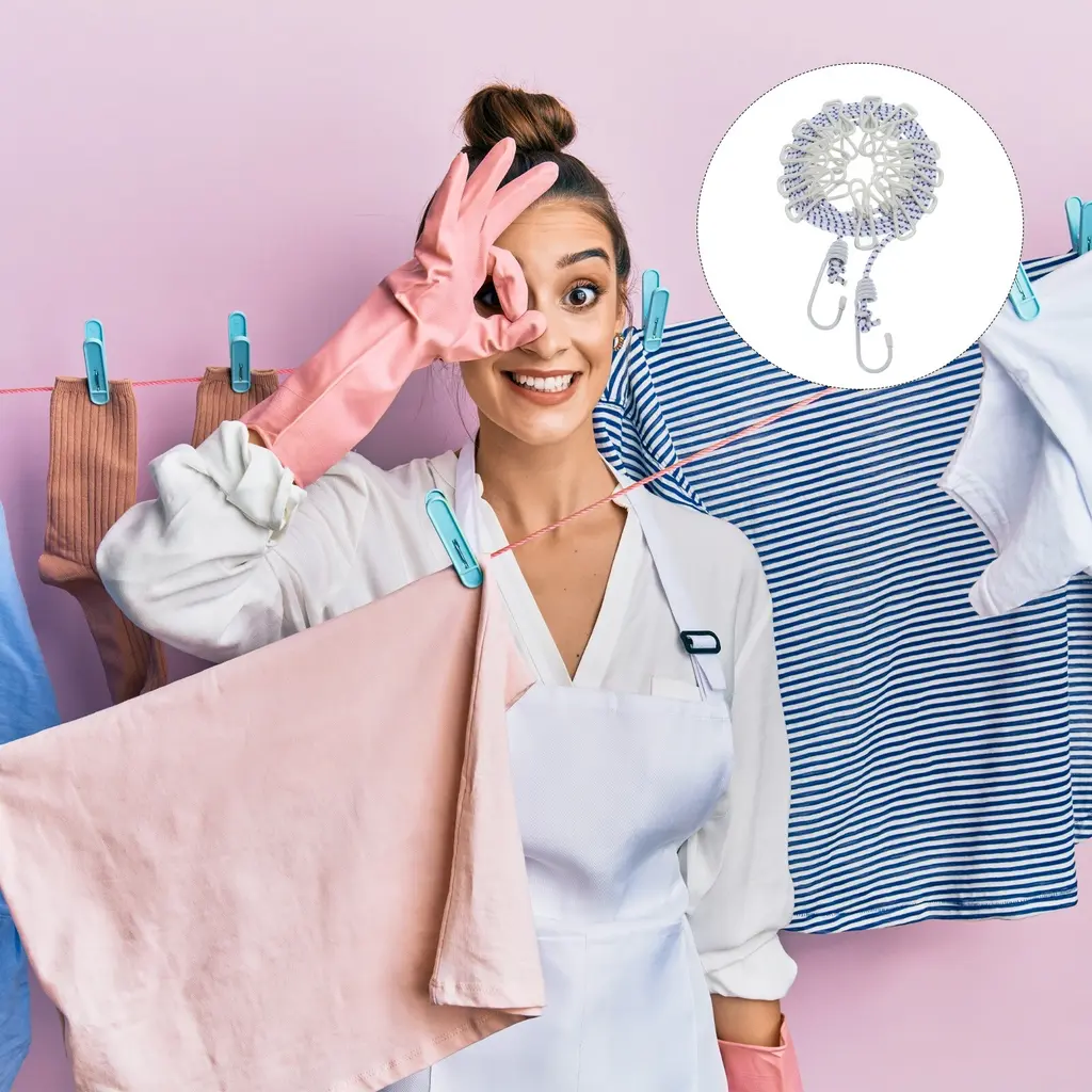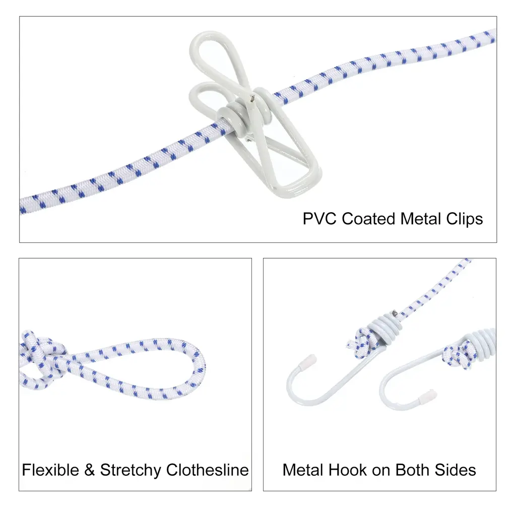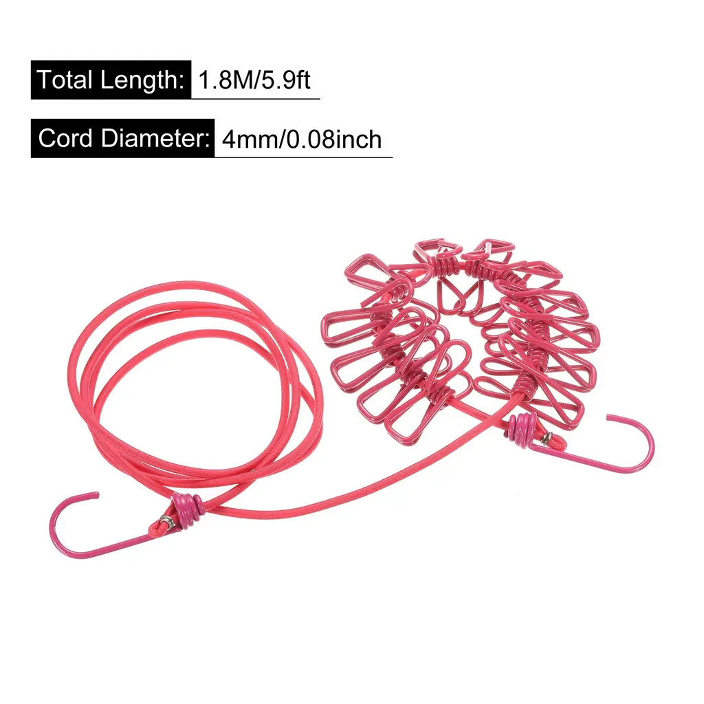 Description:Stretchy Clothesline - Made of multiple strands of elastic rubber band with stretchy and good tenacity. The original length of this clothesline is 1.8M/5.9ft and can be stretched up to 3.4M/11.15ft.Windproof & Portable - Portable clothesline contains 12 clothespins to keep your clothes firmly stay on the clothesline even suffer strong wind. It is a great choice for outdoor, travel, camping, etc use. Lightweight and no need to prepare extra clothes hangers, save space for your backpack.Flexible Space Use - Easy to store, not occupy space, and flexible install. Comes with metal hooks at both ends which make an instant drying space whenever and wherever you need it.Great Drying Option - The clothesline is easy to fasten with two strong metal hooks. Can be hung up anywhere as long as it withstands the weight of the things you dry: bathroom, balcony, backyard, patio, laundry, hotel, RV, boat or even attached to trees.Wide Application - Strong enough to load up for drying clothes, socks, underwear, bathing suits, towels, scarves, bed sheets, and more. It is a recommended clothesline for family daily use, travel, camping, hiking, outdoor and indoor use.Specification:Material: Rubber Band, PP, IronTotal Length: 1.8M/5.9ftCord Diameter: 4mm/0.08inchPackage Content:1 x Portable Clothesline