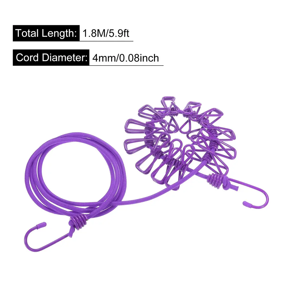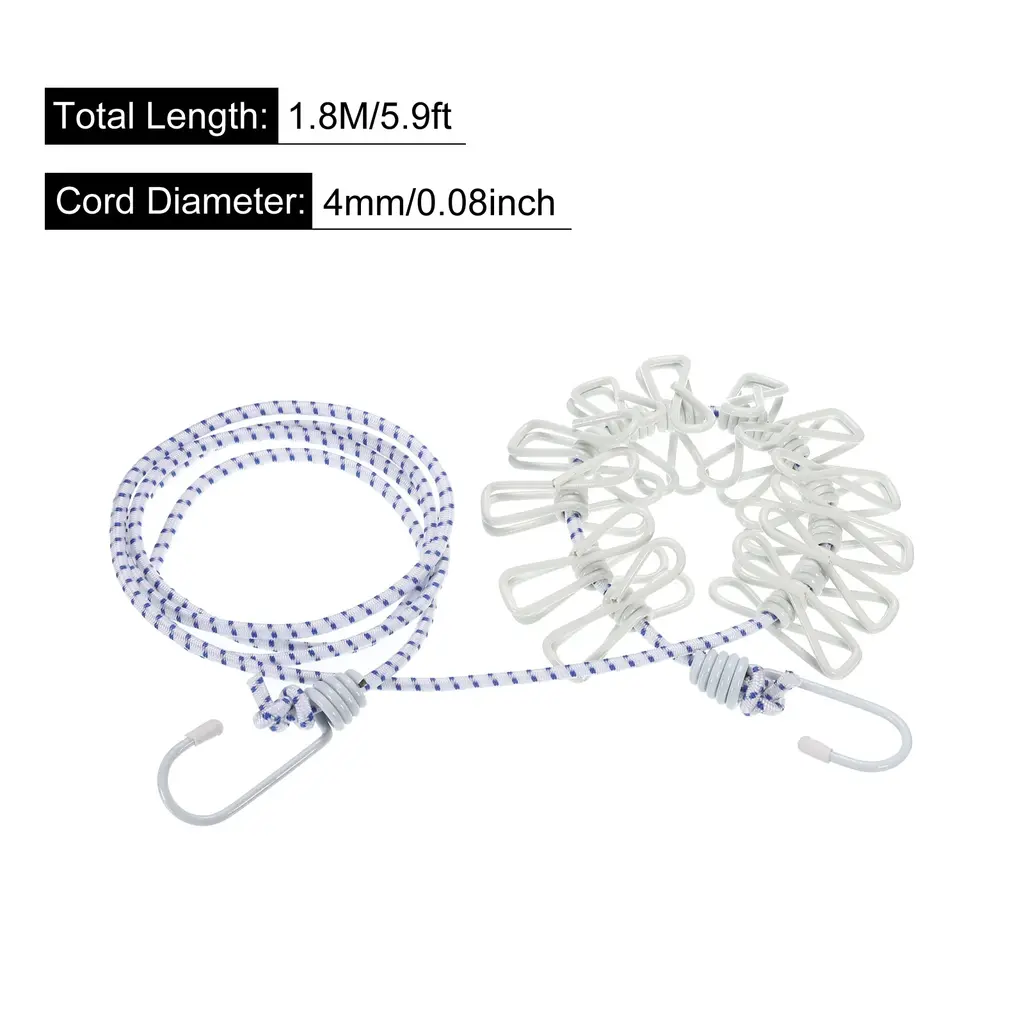 Description:Stretchy Clothesline - Made of multiple strands of elastic rubber band with stretchy and good tenacity. The original length of this clothesline is 1.8M/5.9ft and can be stretched up to 3.4M/11.15ft.Windproof & Portable - Portable clothesline contains 12 clothespins to keep your clothes firmly stay on the clothesline even suffer strong wind. It is a great choice for outdoor, travel, camping, etc use. Lightweight and no need to prepare extra clothes hangers, save space for your backpack.Flexible Space Use - Easy to store, not occupy space, and flexible install. Comes with metal hooks at both ends which make an instant drying space whenever and wherever you need it.Great Drying Option - The clothesline is easy to fasten with two strong metal hooks. Can be hung up anywhere as long as it withstands the weight of the things you dry: bathroom, balcony, backyard, patio, laundry, hotel, RV, boat or even attached to trees.Wide Application - Strong enough to load up for drying clothes, socks, underwear, bathing suits, towels, scarves, bed sheets, and more. It is a recommended clothesline for family daily use, travel, camping, hiking, outdoor and indoor use.Specification:Material: Rubber Band, PP, IronTotal Length: 1.8M/5.9ftCord Diameter: 4mm/0.08inchPackage Content:1 x Portable Clothesline