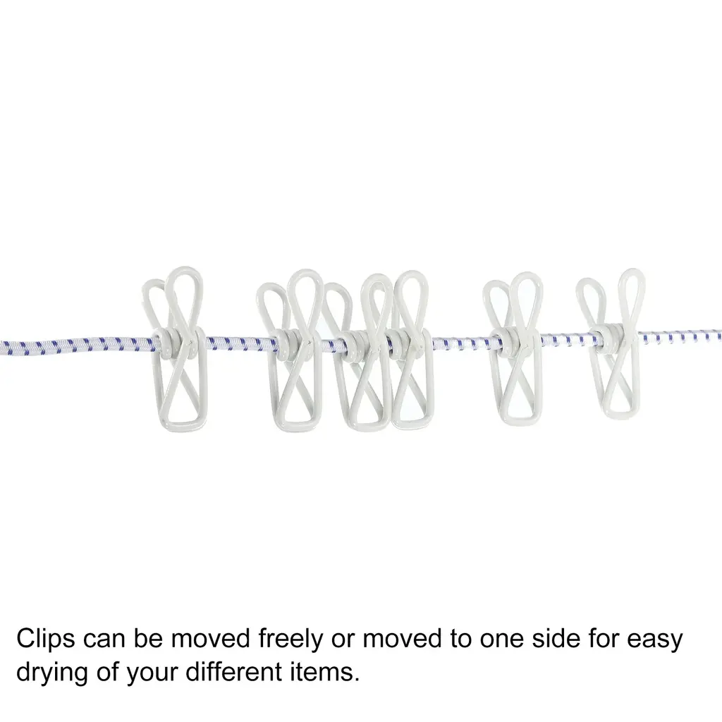 Description:Stretchy Clothesline - Made of multiple strands of elastic rubber band with stretchy and good tenacity. The original length of this clothesline is 1.8M/5.9ft and can be stretched up to 3.4M/11.15ft.Windproof & Portable - Portable clothesline contains 12 clothespins to keep your clothes firmly stay on the clothesline even suffer strong wind. It is a great choice for outdoor, travel, camping, etc use. Lightweight and no need to prepare extra clothes hangers, save space for your backpack.Flexible Space Use - Easy to store, not occupy space, and flexible install. Comes with metal hooks at both ends which make an instant drying space whenever and wherever you need it.Great Drying Option - The clothesline is easy to fasten with two strong metal hooks. Can be hung up anywhere as long as it withstands the weight of the things you dry: bathroom, balcony, backyard, patio, laundry, hotel, RV, boat or even attached to trees.Wide Application - Strong enough to load up for drying clothes, socks, underwear, bathing suits, towels, scarves, bed sheets, and more. It is a recommended clothesline for family daily use, travel, camping, hiking, outdoor and indoor use.Specification:Material: Rubber Band, PP, IronTotal Length: 1.8M/5.9ftCord Diameter: 4mm/0.08inchPackage Content:2 x Portable Clothesline