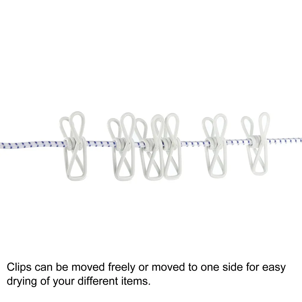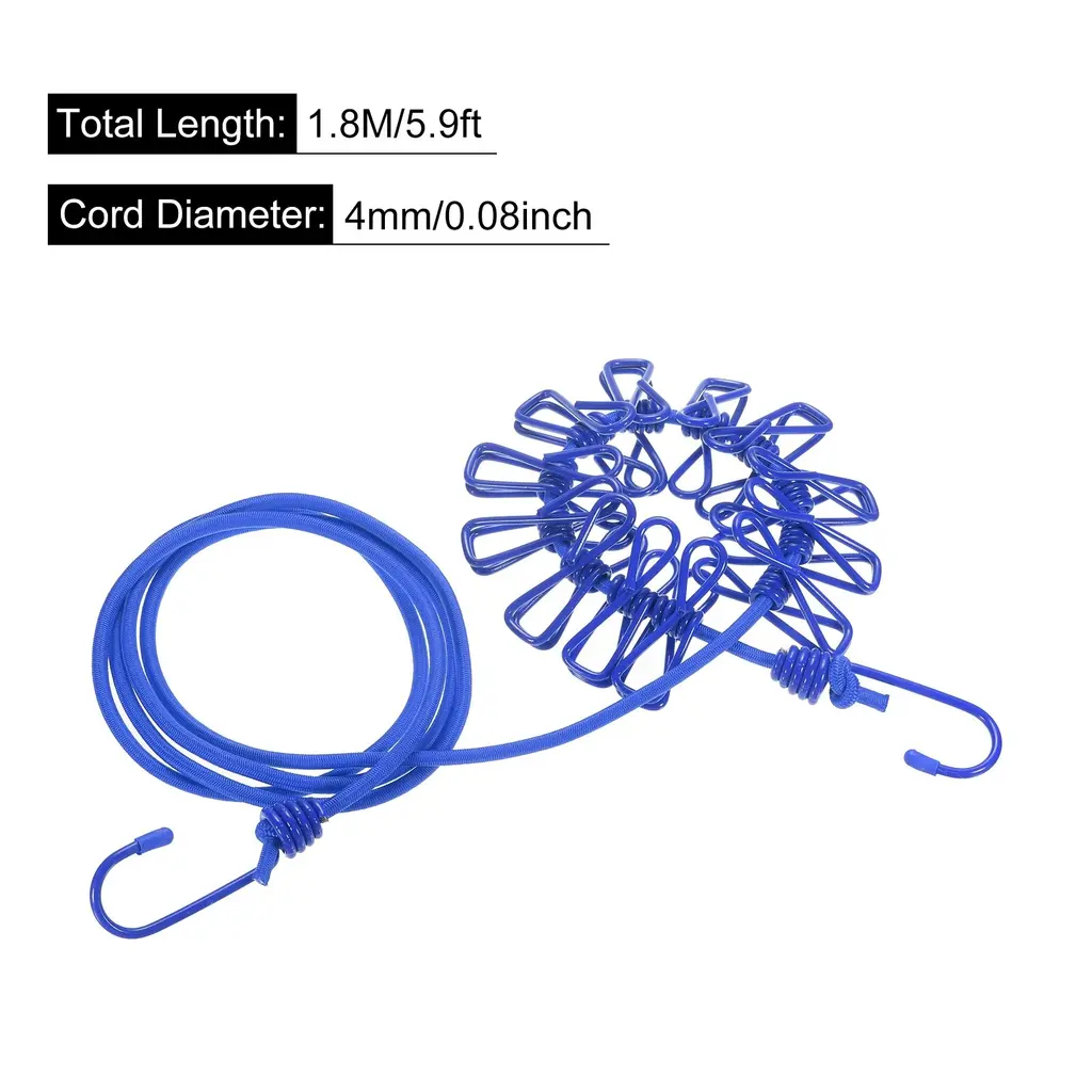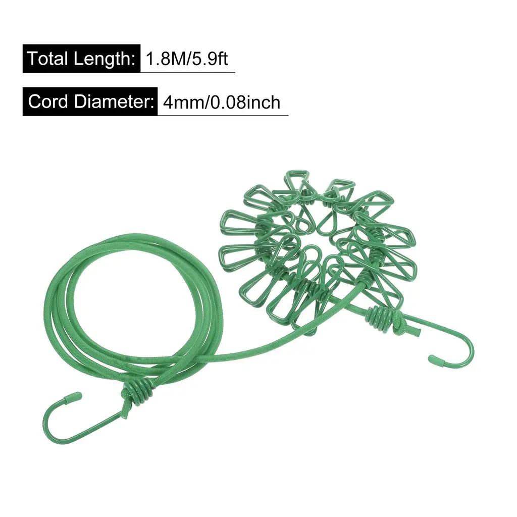 Description:Stretchy Clothesline - Made of multiple strands of elastic rubber band with stretchy and good tenacity. The original length of this clothesline is 1.8M/5.9ft and can be stretched up to 3.4M/11.15ft.Windproof & Portable - Portable clothesline contains 12 clothespins to keep your clothes firmly stay on the clothesline even suffer strong wind. It is a great choice for outdoor, travel, camping, etc use. Lightweight and no need to prepare extra clothes hangers, save space for your backpack.Flexible Space Use - Easy to store, not occupy space, and flexible install. Comes with metal hooks at both ends which make an instant drying space whenever and wherever you need it.Great Drying Option - The clothesline is easy to fasten with two strong metal hooks. Can be hung up anywhere as long as it withstands the weight of the things you dry: bathroom, balcony, backyard, patio, laundry, hotel, RV, boat or even attached to trees.Wide Application - Strong enough to load up for drying clothes, socks, underwear, bathing suits, towels, scarves, bed sheets, and more. It is a recommended clothesline for family daily use, travel, camping, hiking, outdoor and indoor use.Specification:Material: Rubber Band, PP, IronTotal Length: 1.8M/5.9ftCord Diameter: 4mm/0.08inchPackage Content:4 x Portable Clothesline
