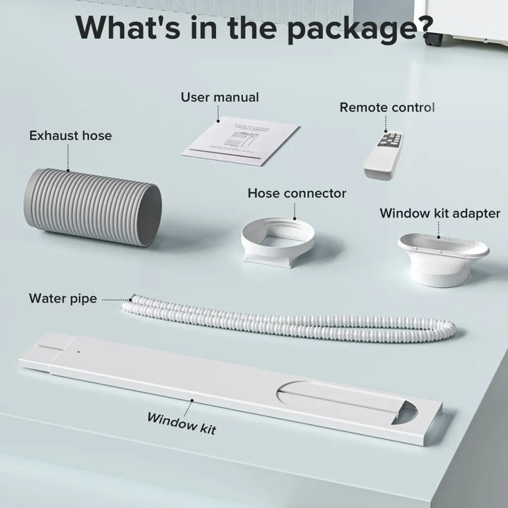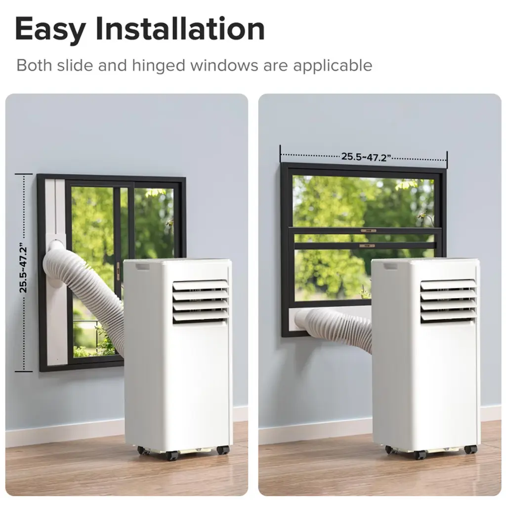 This powerful 3-in-1 portable air conditioner offers Cooling, Fan, and Dehumidification modes, making it ideal for large residences, bedrooms, offices, kitchens, garages, and campsites. With 8000 BTU of rapid cooling power, it efficiently cools spaces up to 350 square feet, reaching temperatures between 62–80°F. The fan features two speed settings and a 75° oscillating angle, while the dehumidifier removes up to 50 pints of moisture per day. Designed for convenience, it includes an LED touch panel and a remote control with a 20-foot range, and operates quietly at just 52dB with a sleep mode for nighttime use. Built-in handles and four 360° swivel wheels ensure easy mobility, and its compact size allows it to fit neatly into small spaces. Installation is simple with a detailed guide and a sliding window kit compatible with both vertical and horizontal windows.