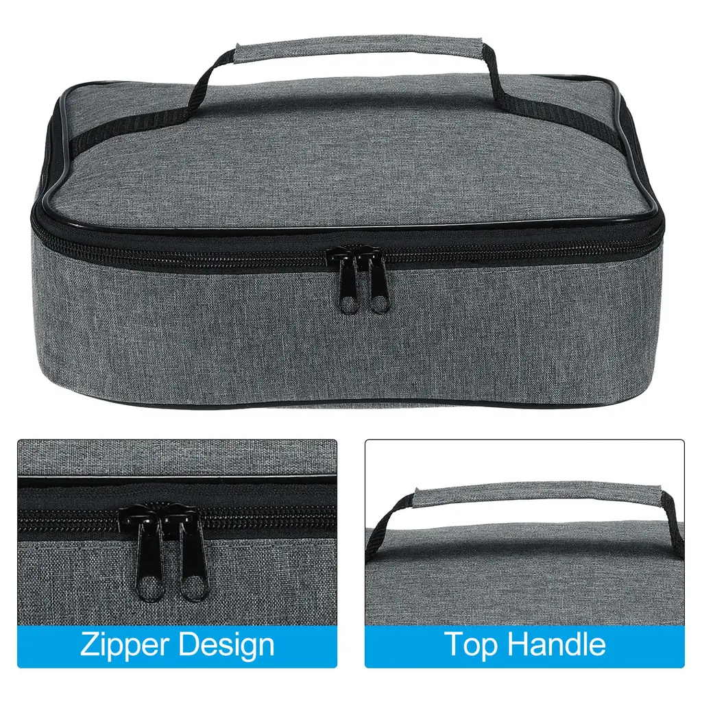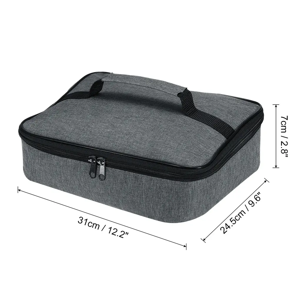 The insulated lunch bag can be used in offices, picnics, camping trips, travel, or any other outdoor activities. You can pack a variety of foods and drinks, including sandwiches, salads, fruits, and more. It is great for keeping your lunch fresh and delicious, no matter where you are.SpecificationColor: Grey, BlackMaterial: Oxford Cloth, Cotton, Aluminum FilmSize: 31 x 24.5 x 7 cm / 12.2 x 9.6 x 2.8 inch(L*W*H)Packing List: 1Pcs x Portable Lunch BagAdvantageThe lunch box bag is made of waterproof Oxford cloth, which is durable and tear-resistant. The interior is equipped with thermal insulation cotton and aluminum film to avoid heat and effectively keep warm and cold, easy to clean.Zipper on the side, easy to open and close. The handle design is convenient for carrying.InstructionPack your favorite foods and drinks into the lunch tote and close it securely. Make sure all closures are properly fastened to prevent spills and leaks. When you are ready to eat, simply open the bag and enjoy your fresh and delicious meal.NOTE:1. After use, wipe down the tote bag with a damp cloth or sponge to clean off any spills or dirt. Let it air dry before storing it away.2. This item is not intended for use by 12 and under.