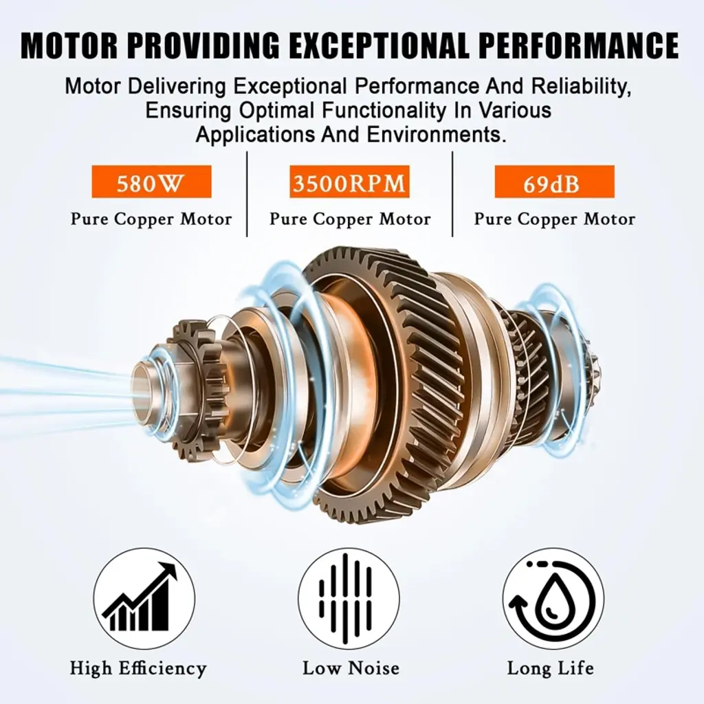 Product Description Color: Orange Power: 580W Voltage: 110V Frequency: 60 Hz Material: Steel Airstream: 3500CFM Fan Diameter: 12/16 Inch Duct: Flexible PVC Ducting Net Weight: 42.8 lbs Fan Dimensions(L x W x H): 15 x 14 x 17.2 Inch Portable Handle & Rubber Feet The industrial extractor fan is humanized designed with an easy-carry handle that is practical and convenient to use, storage, move, and transport. Rubber feet on base help minimize noise, reduce vibrations, and stand stably for a long time. And the lightweight for a fast and easy installation.