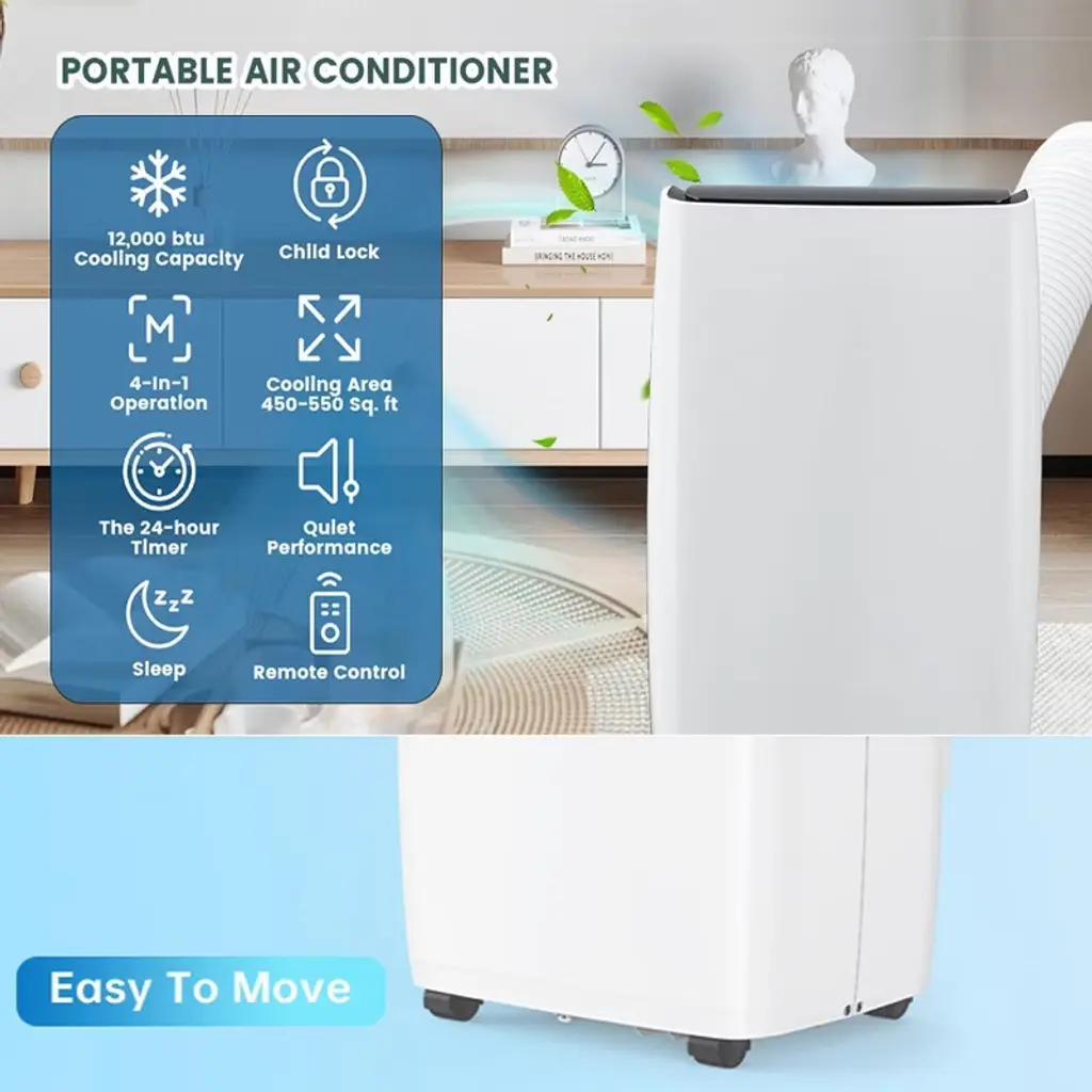 12,000 BTU Portable Air Conditioner – 3-in-1 Cooling, Dehumidifier & 2-Speed Fan for Rooms 450-550 Sq.Ft (24H Energy-Save Timer, Ultra-Quiet) Powerful cooling meets smart efficiency! This 12,000 BTU portable AC delivers industrial-strength cooling for medium to large rooms (450-550 sq.ft), perfect for open living areas, home offices, or rentals. Key Features: ✅ 3-in-1 Versatility: Cool, dehumidify (tackle dampness), or circulate air with a 2-speed fan for customized comfort. ✅ 24H Energy-Save Timer: Automate operation to slash power bills and maintain ideal temps. ✅ Ultra-Quiet Design: Sleep or work undisturbed—ideal for noise-sensitive spaces. ✅ Portable & Easy Setup: No permanent installation; move freely on caster wheels. Energy-efficient and user-friendly, this unit combines high-performance cooling with plug-and-play convenience. Whether battling summer heatwaves or sticky humidity, enjoy fast relief and year-round climate control.