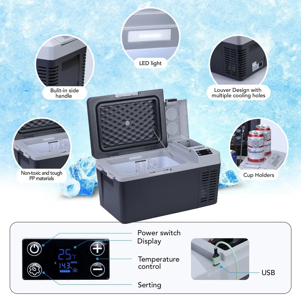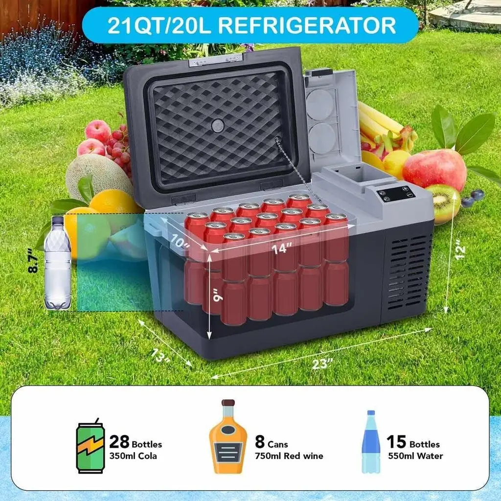 Quick Cooling to -4°F: Using aluminum evaporator and compressor refrigeration technology, this 12V car freezer can achieve rapid cooling from 77°F to 32°F in 20 minutes and from 77°F to -4°F Quickly cools in 60 minutes to keep your food fresh. No ice required, food will not spoil, saving money and space. Low Power Consumption: The portable car refrigerator freezer offers two cooling modes: MAX mode for rapid cooling and ECO mode for improved energy efficiency. The MAX MODE is rated at 45W, while the ECO MODE is rated at 36W. Large 21 Quart Capacity: This 12 volt refrigerator provides you and your family with enough food for your travels. With a temperature range of -4°F~50°F, it can be used as a freezer or refrigerator, providing you with ideal storage conditions for drinks, fruits, sandwiches and frozen foods. Low Noise Operation: The truck freezer is designed with low noise, ensuring you have a good sleep after a long drive. Plus, its lightweight design makes it easy to carry to the beach or anywhere else. The unit includes a recessed handle for added convenience. Home/Car Use and Battery Protection: Comes with AC and DC adapters, the Portable Car Freezer can keep you fresh and cool whether you are at home or on the road. Battery protection allows you to use your refrigerator in a variety of cars, suitable for cars, SUVs, trucks, and most other vehicles.