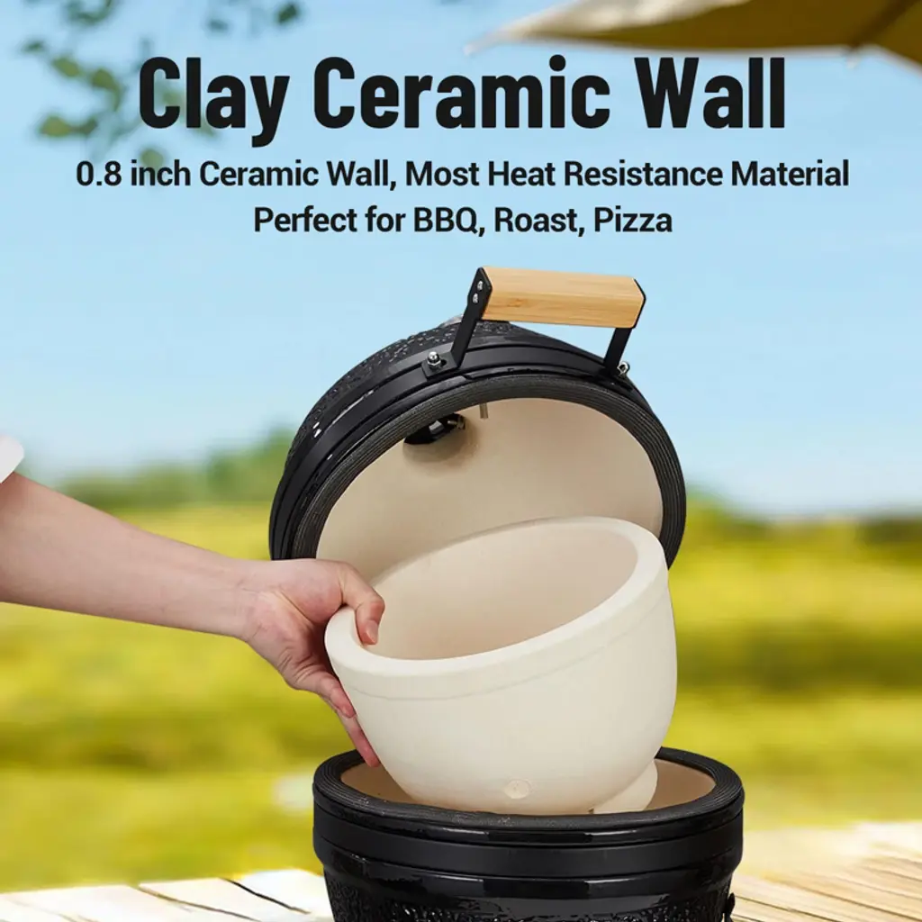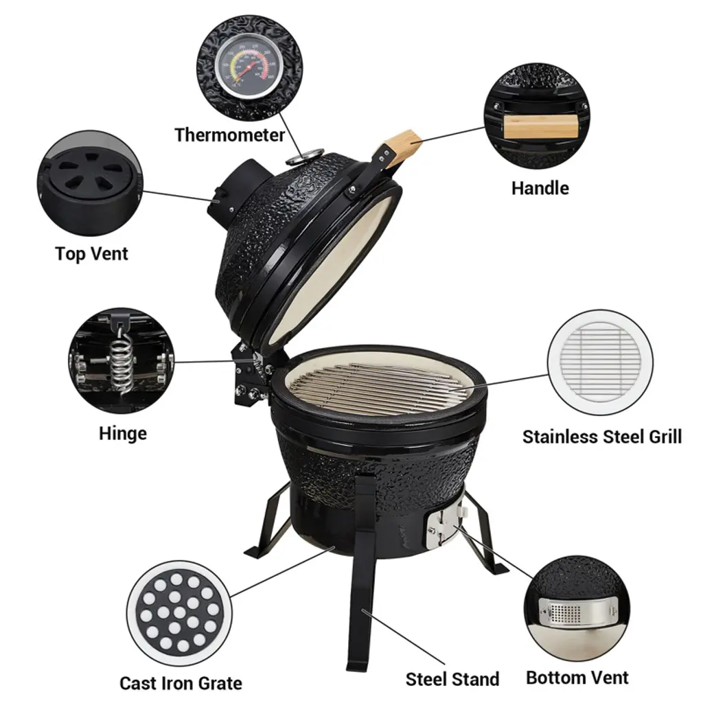 13" Ceramic Charcoal Grill - Versatile Egg-Style Smoker, Grill & Oven for Outdoor CookingAny cooking style with this ceramic egg grill, designed to smoke, sear, bake, and roast with 750°F heat retention. The refractory ceramic walls distribute heat evenly while the cast iron vents offer precise temperature control. Includes porcelain enamel grate, thermometer, and stainless steel stand—perfect for tailgating or backyard BBQs. Weather-resistant and fuel-efficient for year-round use. Handcrafted with a glossy finish that resists cracking.