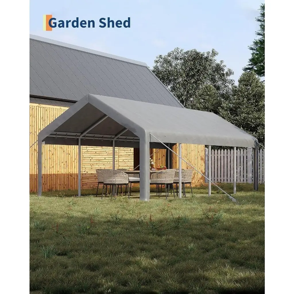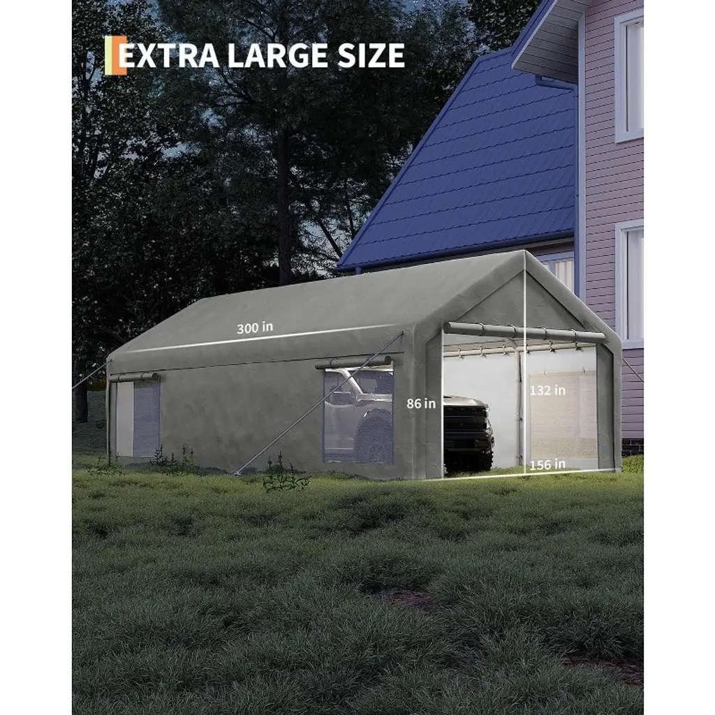 Product ParametersSize: 13 x 25 feet (240 sq. ft. of covered area)Frame Material: 21 Ga. & 18 Ga. galvanized steel polesCoating: Anti-rust, powder-coated finishRoof Load Capacity: 960 lbsCanopy Material: 200g heavy-duty polyethylene (PE) fabricSun Protection: UPF 50+Weather Resistance: Waterproof and dustproofWindows & Doors: Roll-up design for ventilation and convenienceAssembly: Requires 2-3 adults; includes clear instructionsSecuring Accessories: Ground pegs, guylines, and anchors includedRecommended Usage: Suitable for pickups, bass boats, SUVs, sedans, events, and outdoor storageSafety Note: For windy or snowy conditions, use extra sandbags or steel ropes; clear snow above 4 inches promptly.