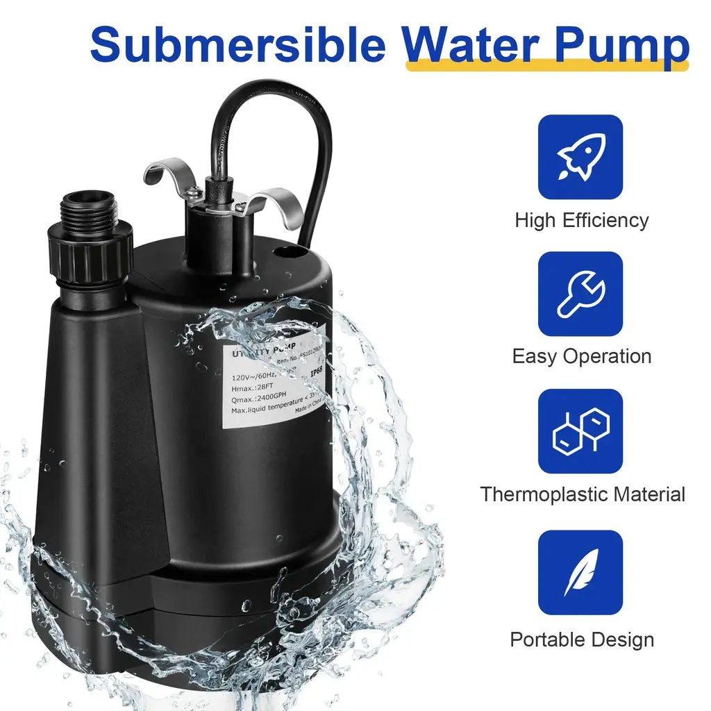 Specifications: Description: ● High-Performance and High-Efficient Motor: The submersible water pump is powered by a 1/3 HP high-performance motor that can lift the water to the max vertical height of 28 ft and remove water up to 2400 gallons per hour at zero feet, easily and quickly tackling any draining job. Besides, it features thermal overload protection, ensuring safety in use.● Easy Operation: There equips with 2 hose connectors (GHT 3/4" and 1" NPT discharge) to connect different threaded hoses. And the 10 ft power cord offers a large work area from the power supply, just plug it for quick water drainage. Besides, it can be used under full water or at water levels of just 0.2" and remove water down to a residual level of just 0.08".● Reinforced and Durable Material: The water pump cover is made of thermoplastic materials that are characterized by excellent durability and corrosion resistance, ensuring years of repeated use. And it features 2 ergonomic metal handles, bringing convenience for movement. The household submersible utility pump with a portable and compact design is easy to store without taking up much floor space.● Easy-Cleaning and Detachable Inlet Screen: The portable electric water pump is equipped with a detachable inlet screen to filter debris, leaves, or stone, protecting the pump from damage to prolong service life. And we suggest cleaning it at regular intervals for ensuring the best possible operation.● Multifunctional Design: This high-flow submersible sump pump is suitable for the environment where the water temperature does not exceed 95 °F. It is designed for household water draining, emptying, or removing. You can use it for the swimming pool, garden pond, flooded basement or kitchen, irrigation for the garden or farm, and more.