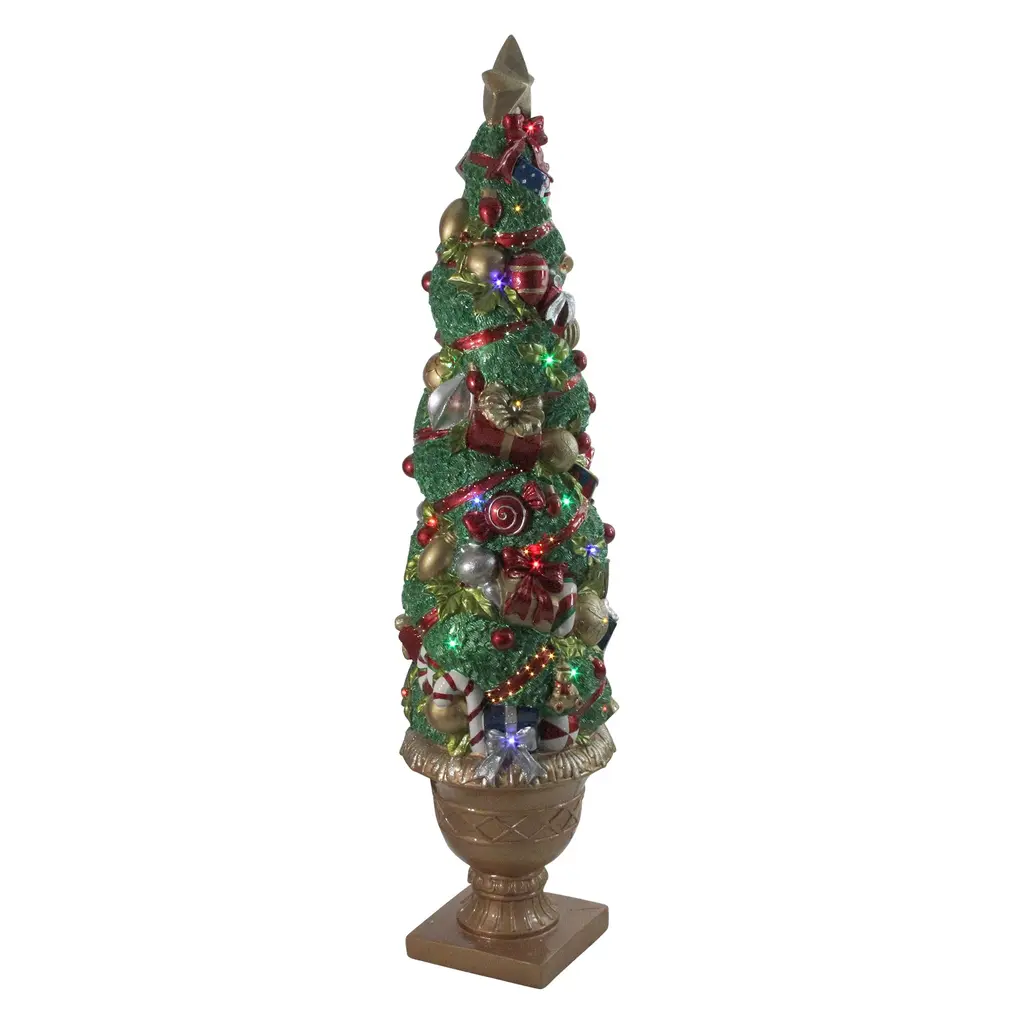 Transform your space into a festive wonderland with this Christmas tree. This handcrafted tree features gold accents and intricate hand painted details, radiating holiday spirit with its cheerful colored lights and sparkling star. Powered by three replaceable AA batteries (not included), this timeless piece will bring joy and elegance to your holiday decor for many seasons to come. Product Features: White Christmas tree with a star topper Designed with multi color bulbs Gold accents and hand painted details for a refined look Required 3 replaceable AA batteries - not included Elevate your holiday decor with this classic and enchanting piece For indoor use only Dimensions: 14"H x 7"W x 7"D Material(s): ceramic