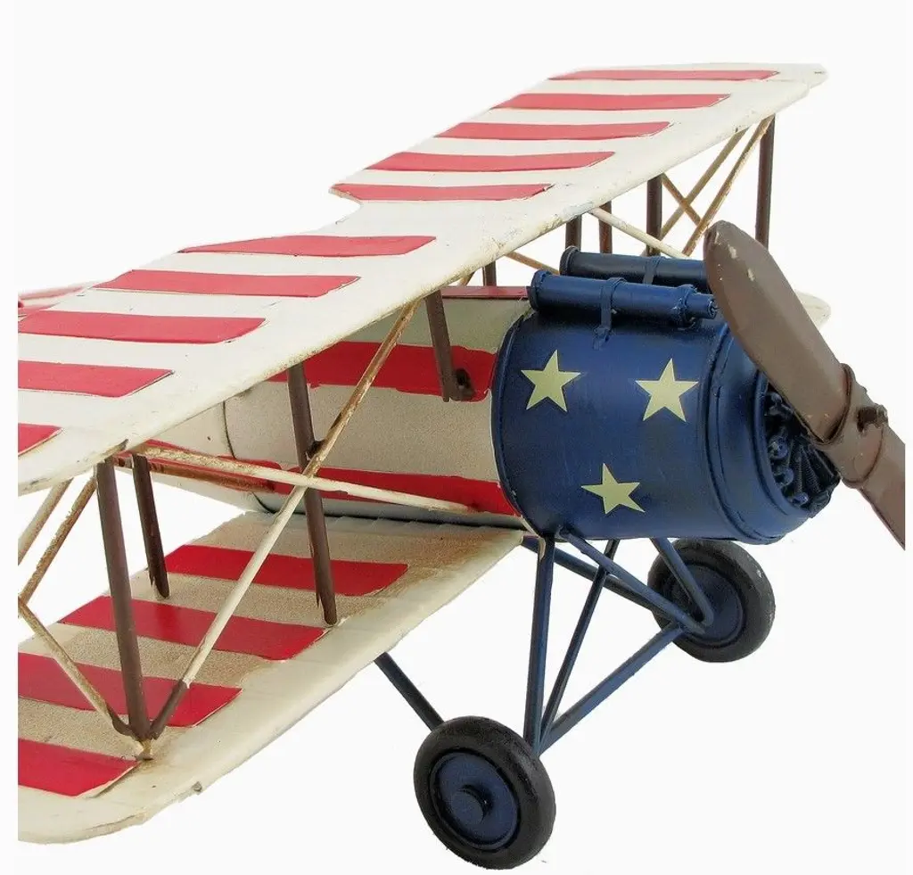 14" Long Metal Tabletop Americana Airplane. Zaer Ltd.'s Tabletop Americana Model Airplane adds a charming, decorative touch to any space. Each piece is hand-painted and iron-crafted with intricate, realistic details, making them ideal for display on shelves, tabletops, or as centerpieces. These versatile accents are perfect for enhancing any retail inventory. Matching pieces sold separately. Fully assembled. Manufacturer: Faire.