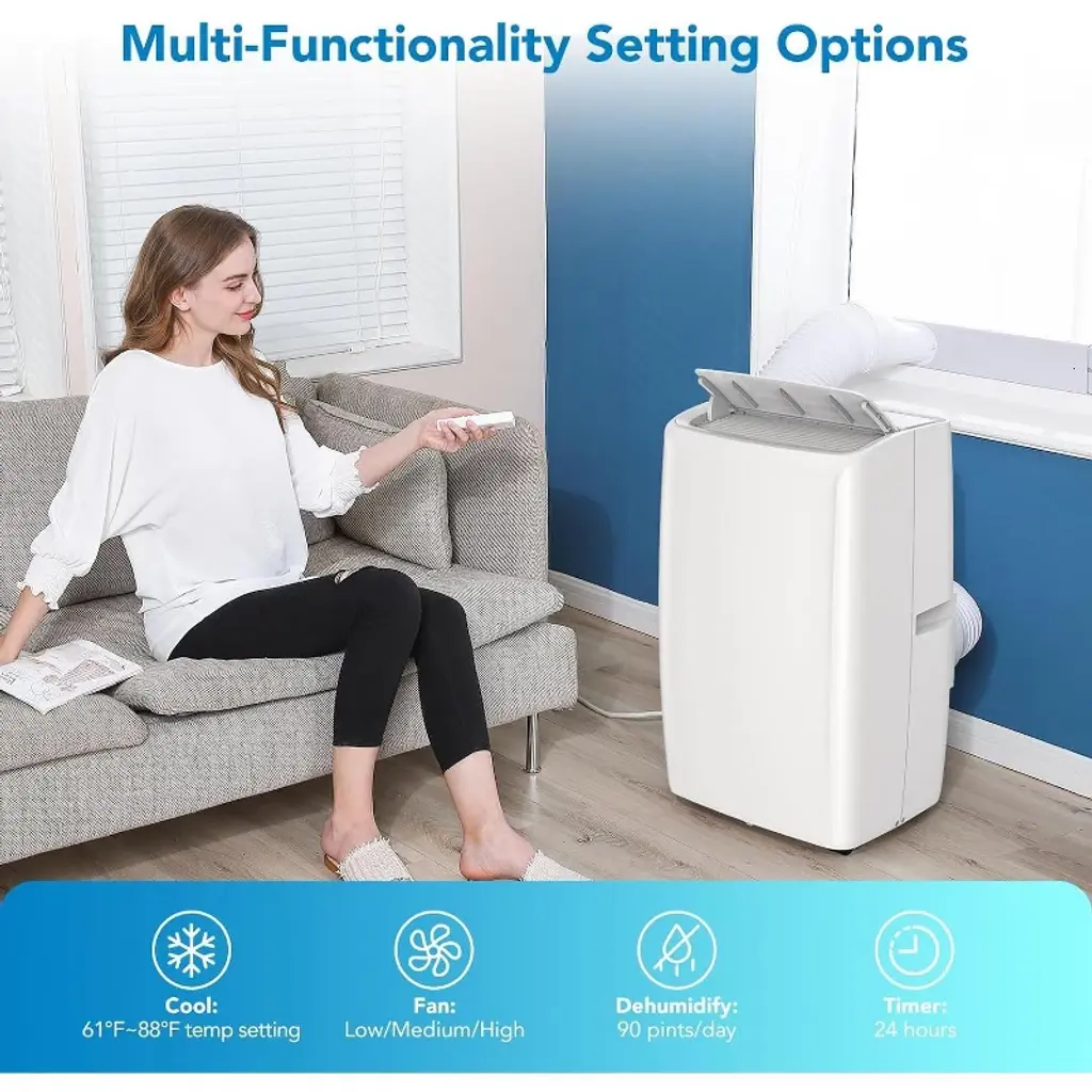 Beat the summer heat with this 14,000 BTU 6-in-1 Portable Air Conditioner, engineered for powerful cooling and versatile year-round climate control. Perfect for medium to large spaces up to 750 square feet, this unit is your all-in-one solution for comfort, combining cooling, fan-only, dehumidifying, air purifying, sleep mode, and auto mode into one compact machine. Equipped with advanced noise-reduction technology, it runs at just 51 dB¡ªquiet enough for bedrooms or study spaces. The smart LED control panel and remote offer easy access to all functions, including temperature (59¡ãF¨C88¡ãF), fan speed, 24-hour timer, and more.
