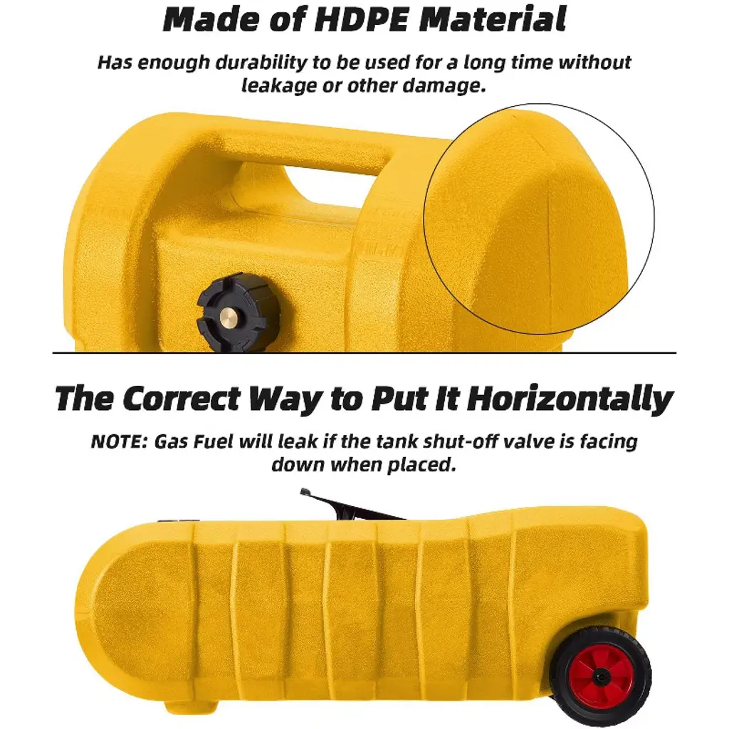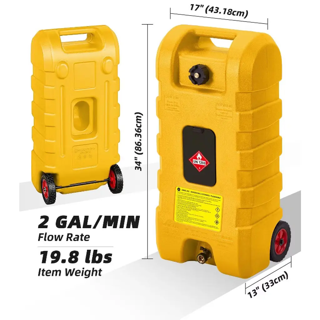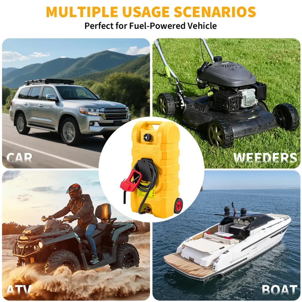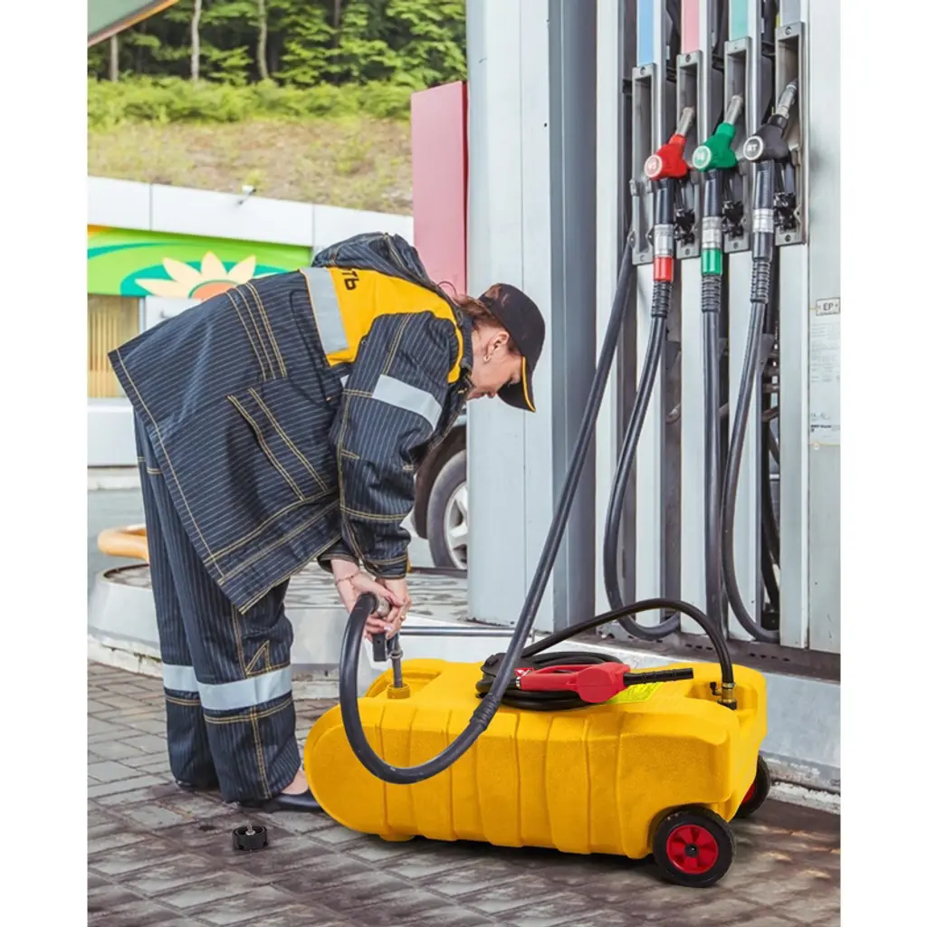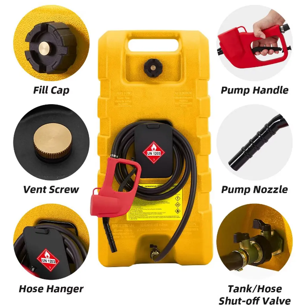 Product Description15-Gallon Portable Gas Can with Siphon Pump – Heavy-Duty Fuel Transfer Tank for Gasoline, Diesel & KeroseneThis 15-gallon fuel tank features a built-in siphon pump and 10ft hose for safe, spill-free transfers. Perfect for generators, tractors, boats, and job sites—no more messy funnels or lifting heavy cans!KEY FEATURESSAFE & EFFICIENT TRANSFERSLE-30 manual siphon pump – Moves 5 gal/minute without mouth suction10ft reinforced hose – Reaches awkward fills (ATVs, mowers)Auto-stop vented spout – Prevents overflowsMILITARY-GRADE DURABILITYHDPE construction – Crack-resistant in extreme tempsUV-stabilized outer shell – Withstands sunlight degradationLockable bung lids – Complies with EPA/OSHA storage rulesSPECSCapacity: 15 gallons (57 liters)Dimensions: 17"L x 13"W x 34"HHose Length: 10ft Weight: 19.8 lbsTemp Range: -40°F to 140°FPERFECT FOR:Diesel equipment – Tractors, excavatorsEmergency prep – Generator fuel reserveMarine use – Boat refueling docksideOff-road adventures – UTVs/ATV support