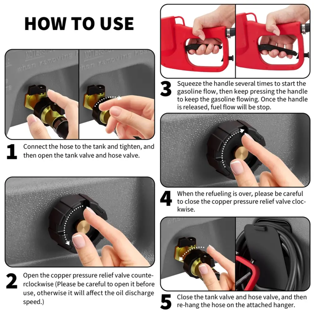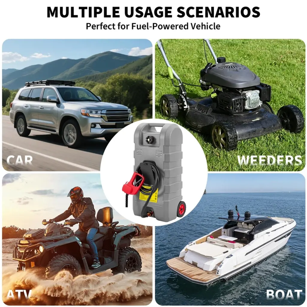 Large Capacity & Durable Build: This 15-gallon gas can is crafted from heavy-duty HDPE material, offering outstanding durability that's UV-resistant, corrosion-resistant, and scratch-resistant. Perfect as a fuel transfer tank or gas container for cars, boats, and lawn mowers Safe & Leak-Proof Operation: Equipped with dual brass shut-off valves at the tank base and hose connection, plus vapor-tight seals and an anti-static grounding wire, this fuel tank ensures safe, leak-free storage and transfer of gasoline, diesel, or kerosene Efficient Manual Transfer Pump: The gas tank features an innovative siphoning system with a stop-and-go pump handle, preventing fuel spills and overfills. Enjoy rapid fueling with a 2-gallon-per-minute flow rate, making it a reliable gas can with manual transfer pump & 10 ft hose Portable & Easy to Maneuver: Designed with two heavy-duty 6-inch wheels and an ergonomic top carry handle, this gas caddy glides smoothly across various terrain. The 10-foot automotive-grade rubber hose and hose hanger offer added convenience and easy storage Versatile Fuel Compatibility: Compatible with gasoline, diesel, and kerosene, this portable fuel container is the ideal fuel caddy for lawn equipment, marine engines, power tools, or off-grid fuel reserves¡ªmaking refueling quick, safe, and hassle-free