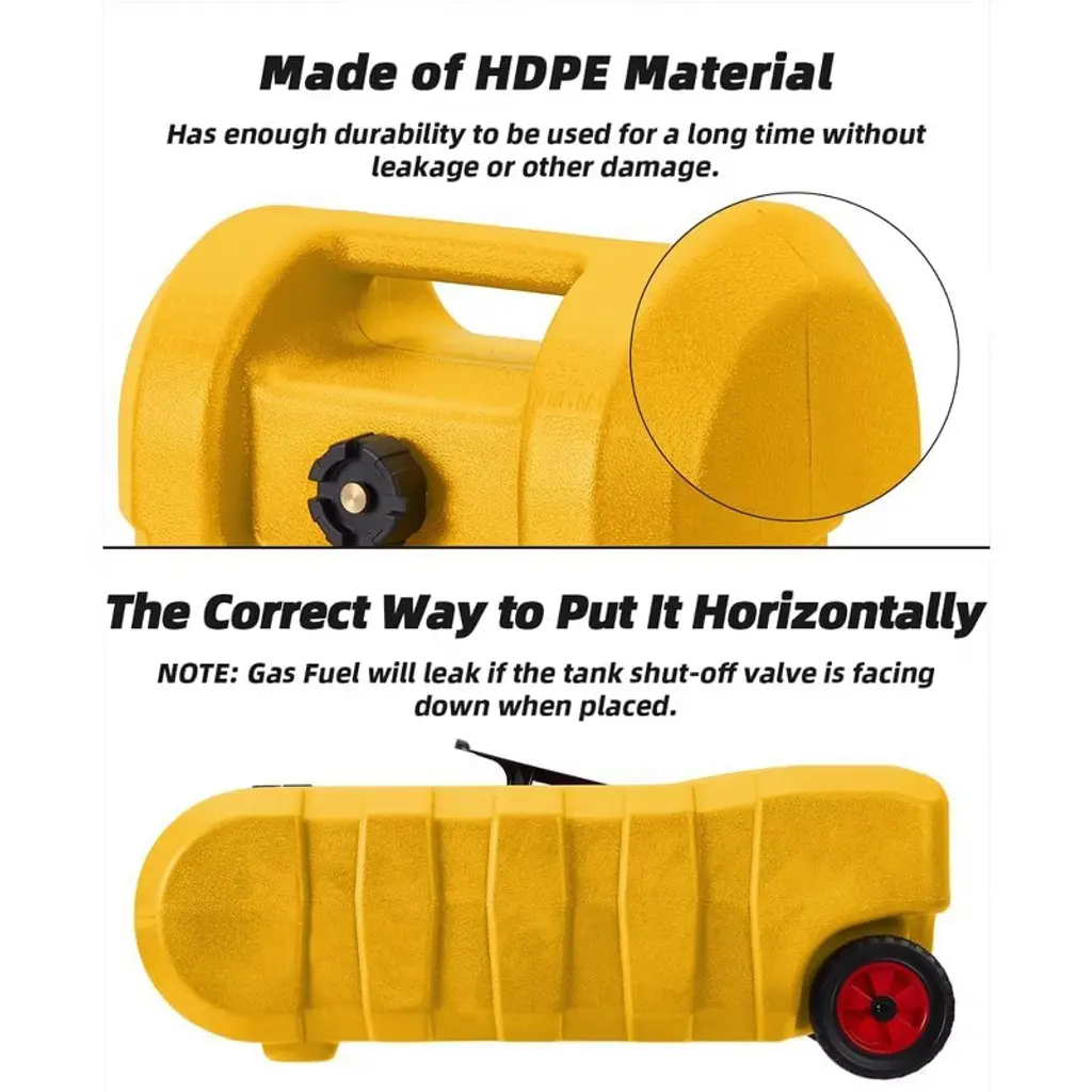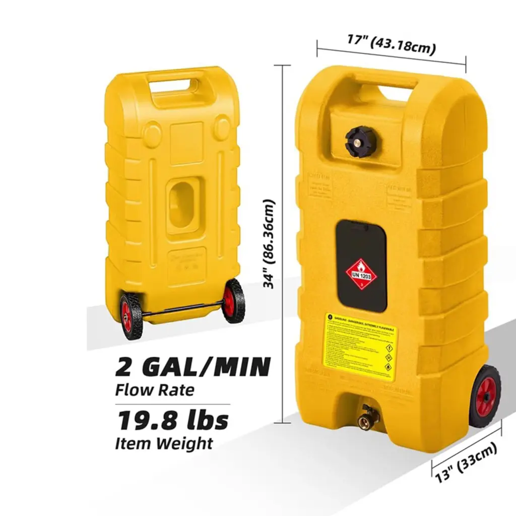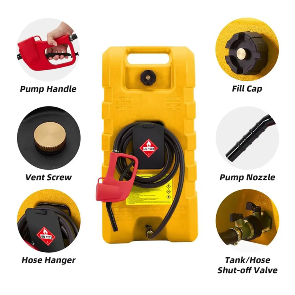 Heavy-Duty Gas Can Construction: Built from industrial-grade HDPE, this gas can and gas tank resists corrosion, dents, and UV rays for lasting durability. The reinforced walls and tough design make this gas caddy ideal for rugged outdoor use, emergency fuel storage, or demanding job sites in extreme temperatures. Secure & Leak-Proof Fuel Tank: Our fuel can features dual shut-off valves and vapor-tight seals, preventing spills while securely storing gasoline, diesel, or kerosene. The advanced safety design includes a child-resistant cap and anti-static grounding, making this fuel tank safe for home, garage, or workshop environments. Efficient Fuel Transfer Pump: Equipped with a manual fuel transfer pump and ergonomic T-grip handle, you can quickly and precisely refuel your equipment. The flexible, reinforced hose and 360¡ã rotating nozzle on this boat gas can make filling generators, tractors, and boats easy, mess-free, and controlled. Portable Fuel Caddy Design: Move fuel anywhere you need it! This gas caddy features 8¡± heavy-duty wheels, a collapsible pull handle, and ergonomic side grips for easy transport across gravel, grass, or rough terrain. The lightweight construction keeps this fuel caddy lighter and more manageable than steel alternatives. Versatile Multi-Fuel Compatibility: Use as a gasoline storage tank, gas tank, or 15 gallon gas can for gasoline, diesel, kerosene, or biodiesel. Gallon/liter markers, integrated tool storage, and stackable shape make this fuel tank perfect for emergency generators, marine engines, landscaping equipment, and more.